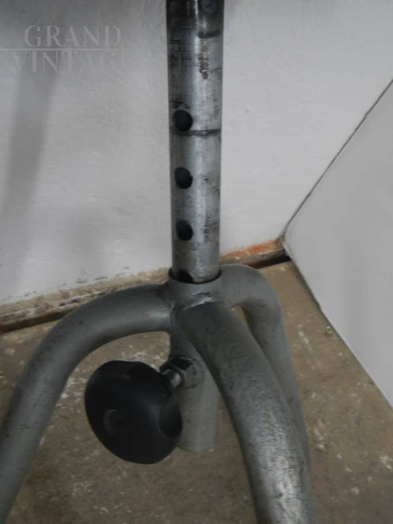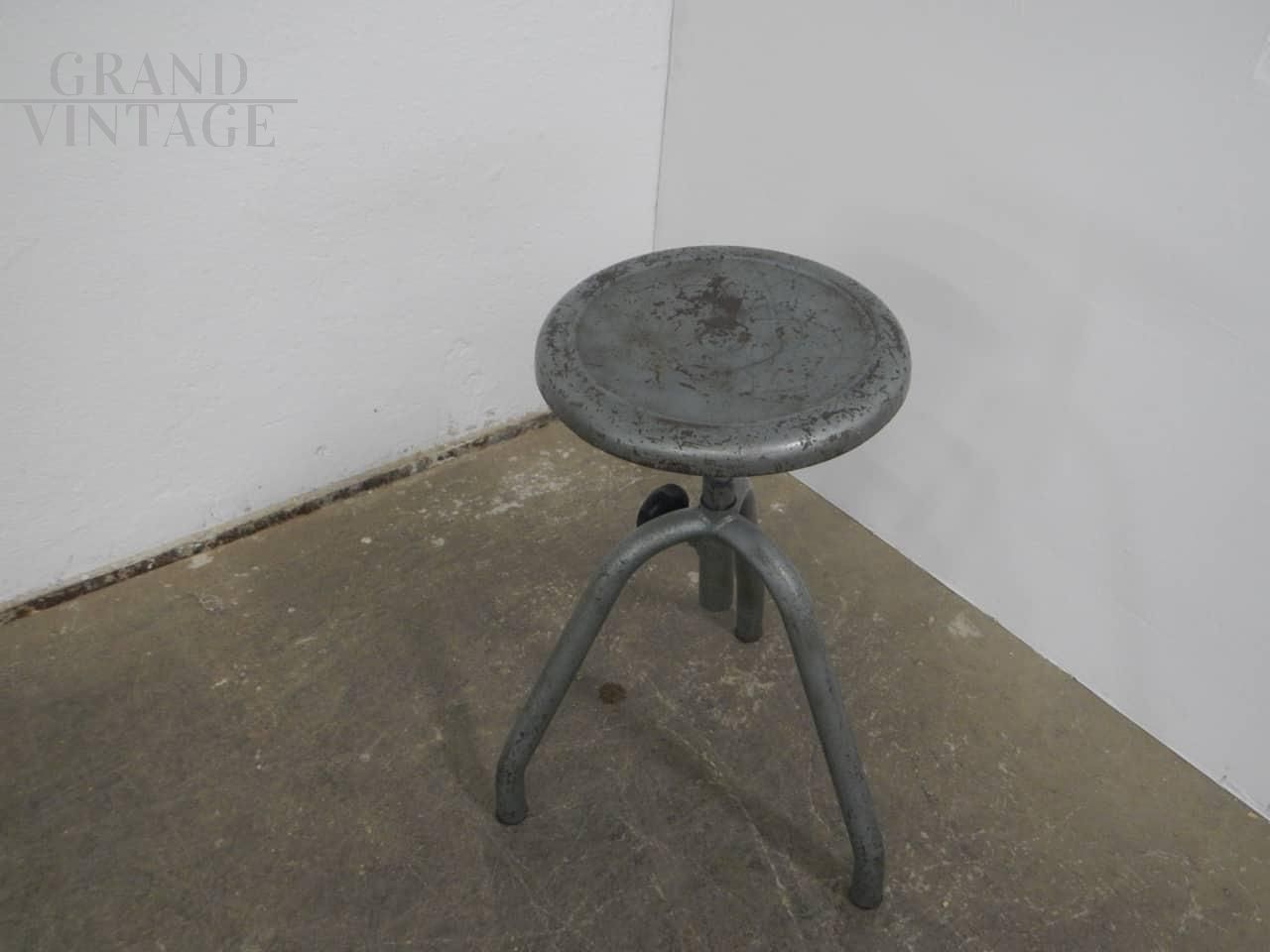 Sgabello da officina vintage industriale a 3 gambe in ferro laccato verde, regolabile in altezza fino a 56 cm, diametro seduta 30 cm. Restaurato e trattato con vernice da ferro.