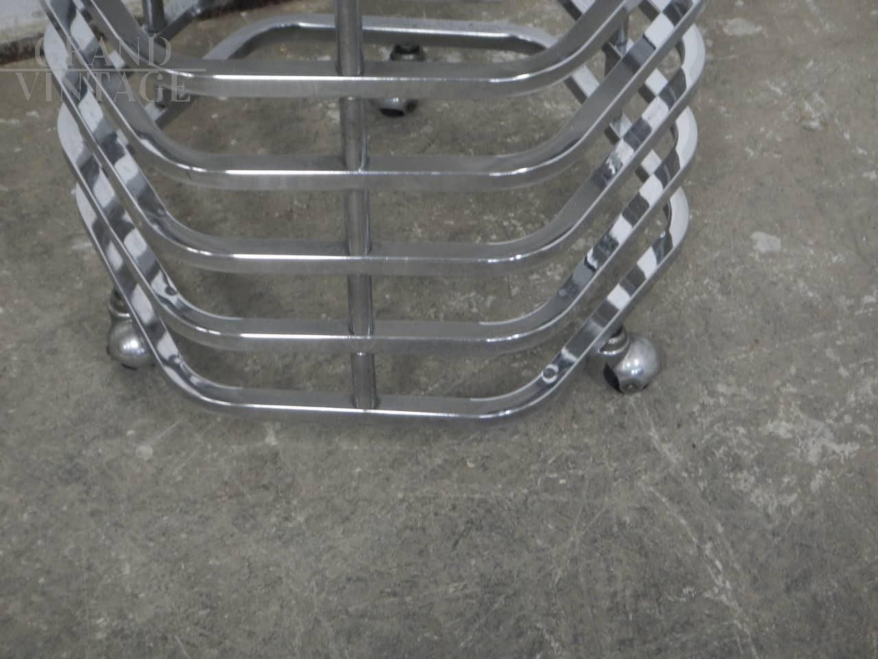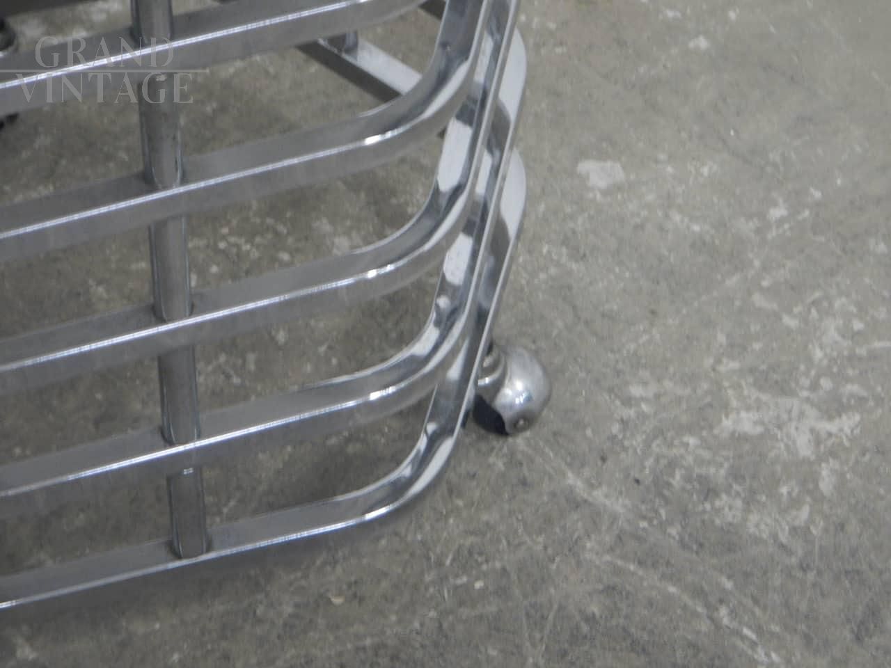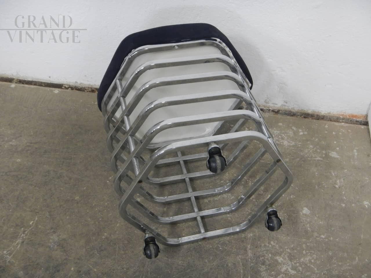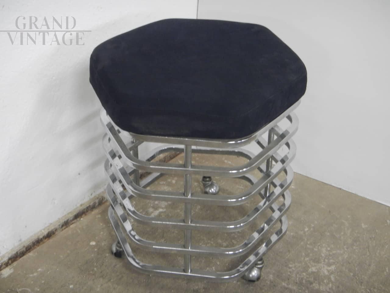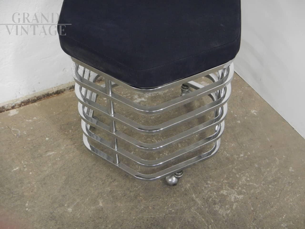Sgabello vintage design con base in metallo cromato con particolare forma a spirale, ruote originali e seduta ritappezzata con pelle scamosciata blu. In ottime condizioni.