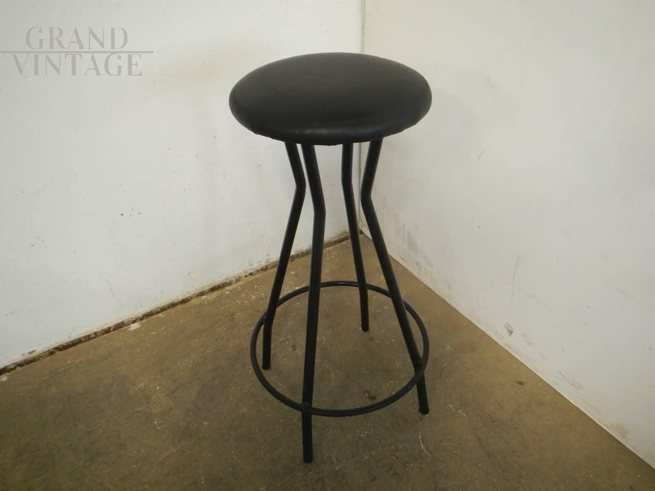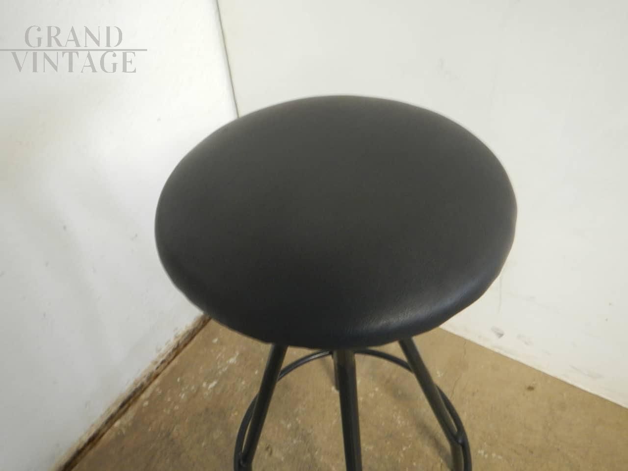 Sgabello alto vintage con struttura in ferro nero a 4 gambe con poggiapiedi e seduta in compensato imbottito e ricoperto in skai nero. In buone condizioni.