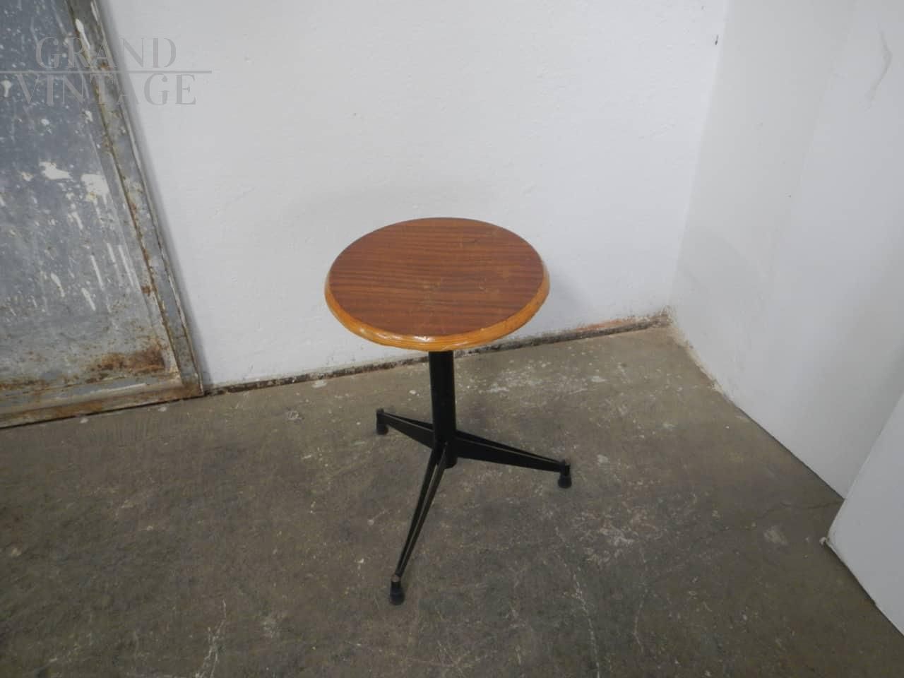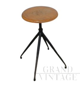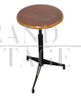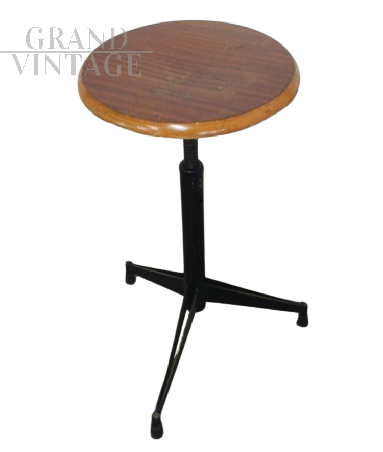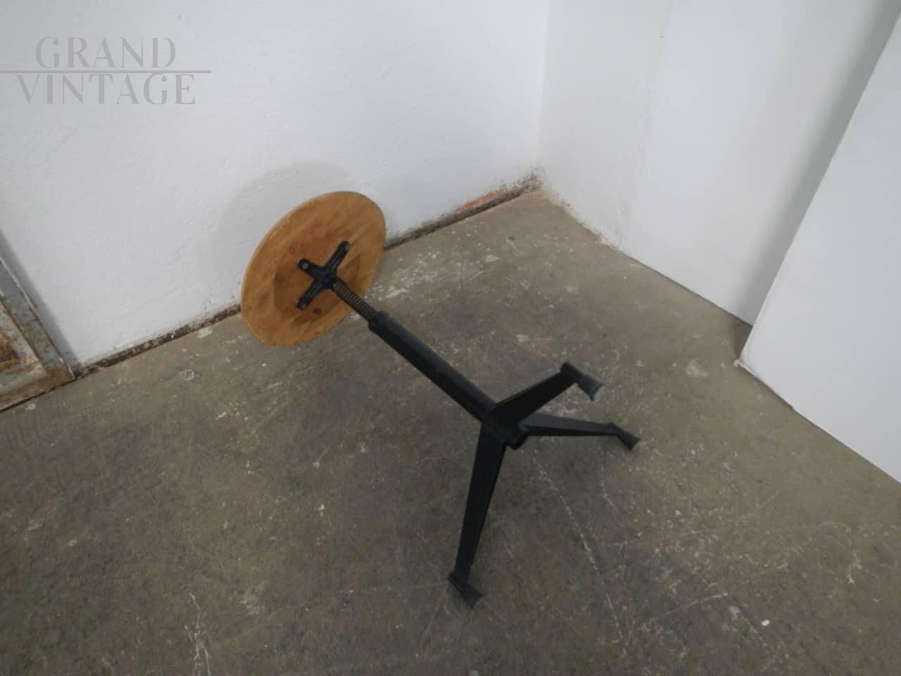 Sgabello vintage industriale girevole e regolabile con tre piedi, la struttura è in ferro nero e la seduta rotonda è in legno di faggio. Regolabile in altezza da 49 a 60 cm, pulito e trattato con vernice da ferro e cera da legno.