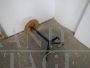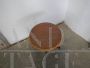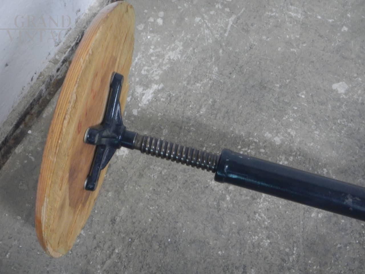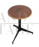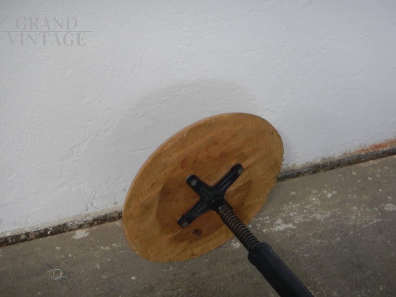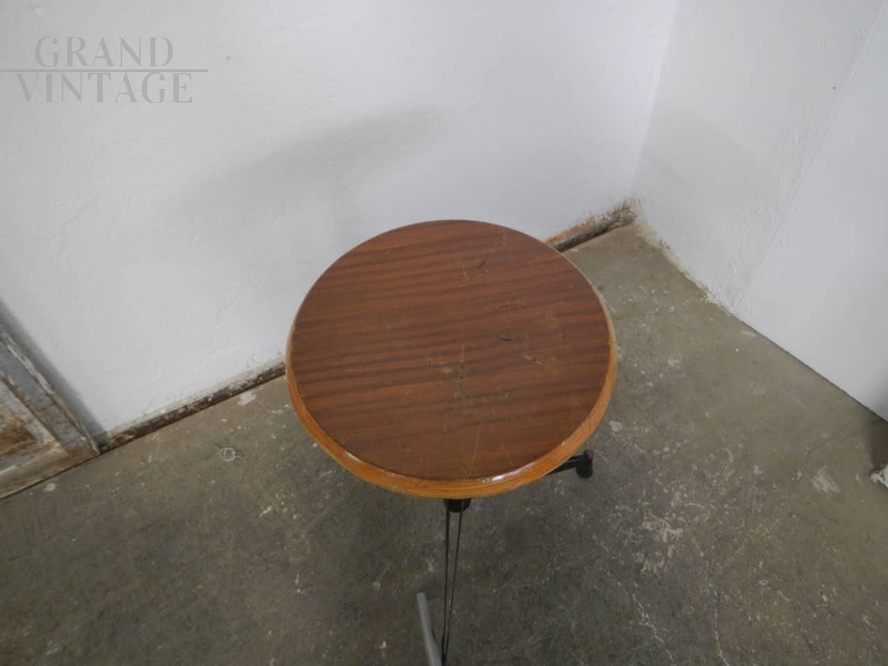 Sgabello vintage industriale girevole e regolabile con tre piedi, la struttura è in ferro nero e la seduta rotonda è in legno di faggio. Regolabile in altezza da 49 a 60 cm, pulito e trattato con vernice da ferro e cera da legno.