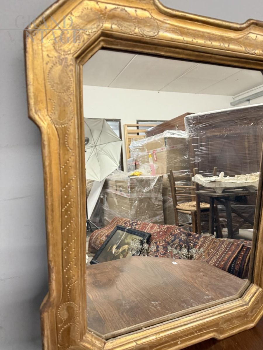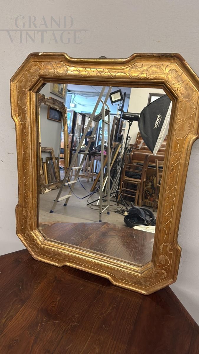 Antica specchiera a vassoio di metà '800 con cornice in legno con foglia d'oro e con lavorazione incisa, 63 x 53 cm. Stato molto buono, presenta solo piccoli segni d'usura.