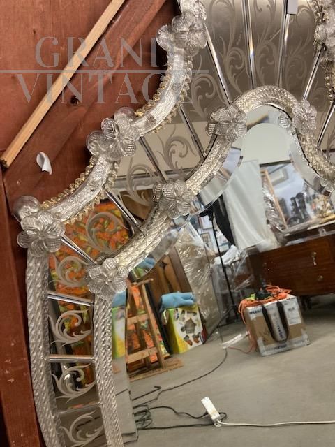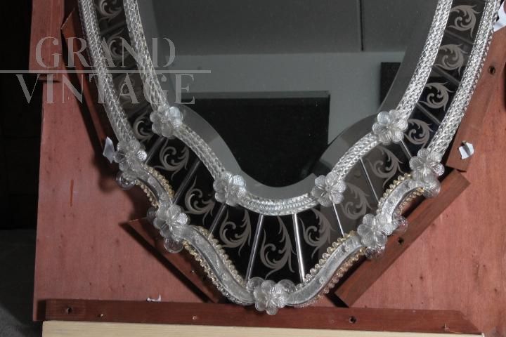 Importante specchiera vintage art déco anni '50 con cornice in vetro artistico decorato con fiori e fantasie in rilievo in vetro trasparente e oro. Stupendo.