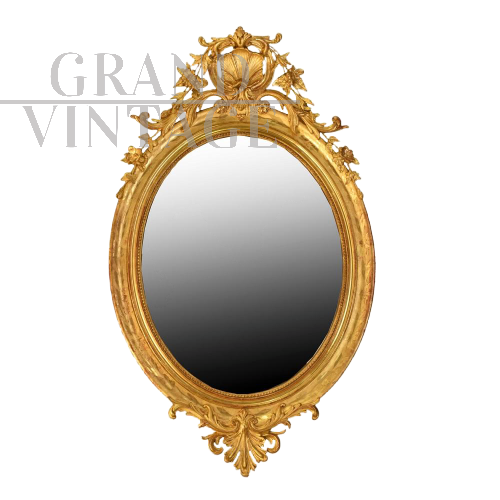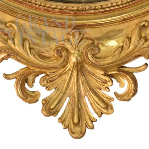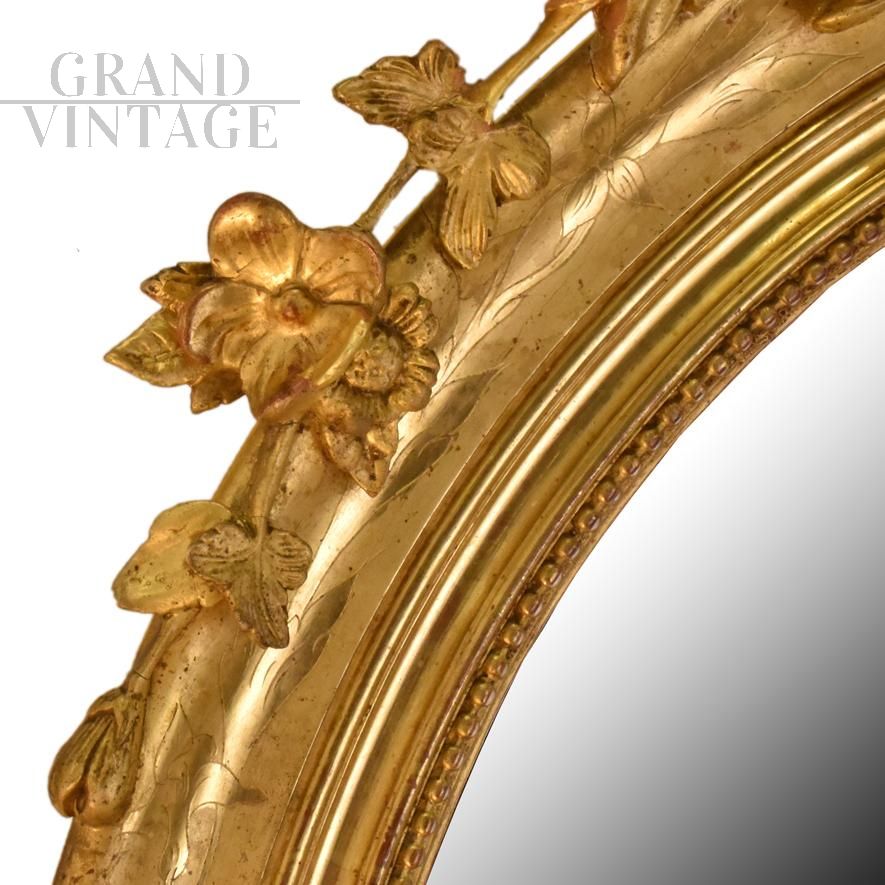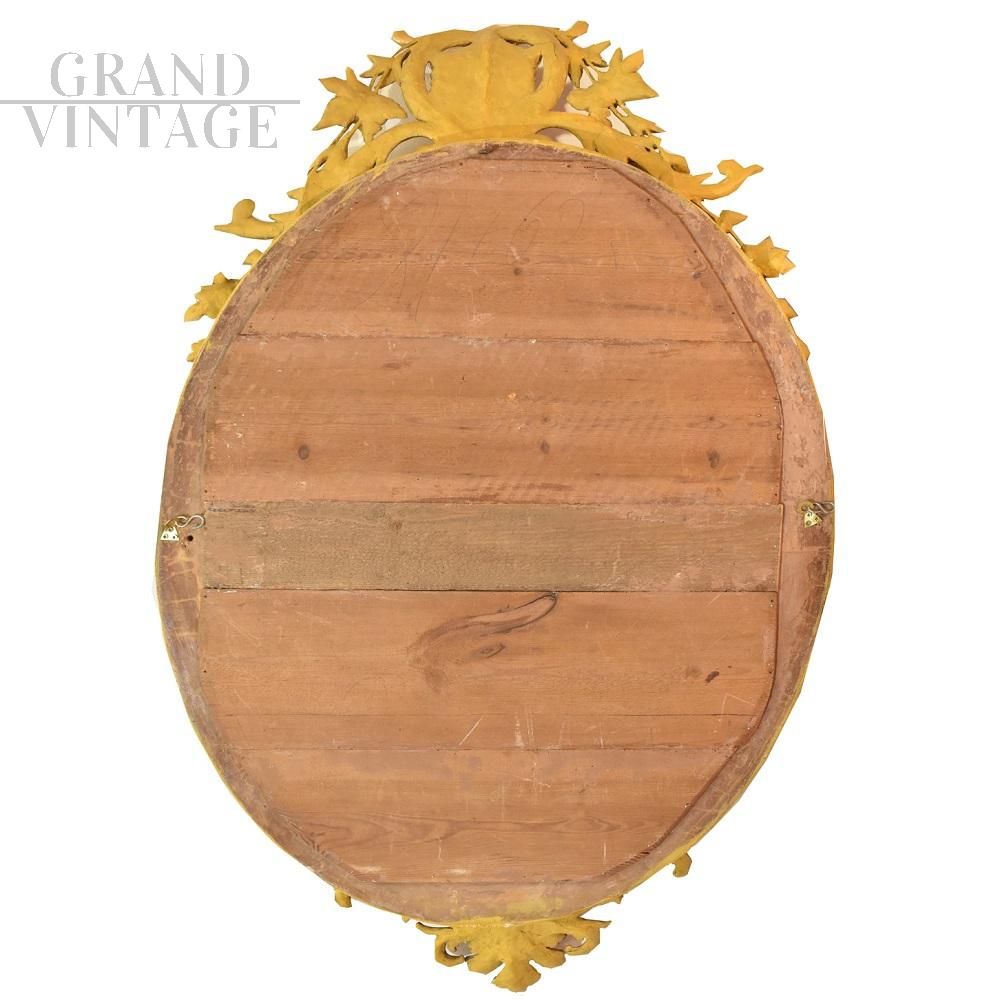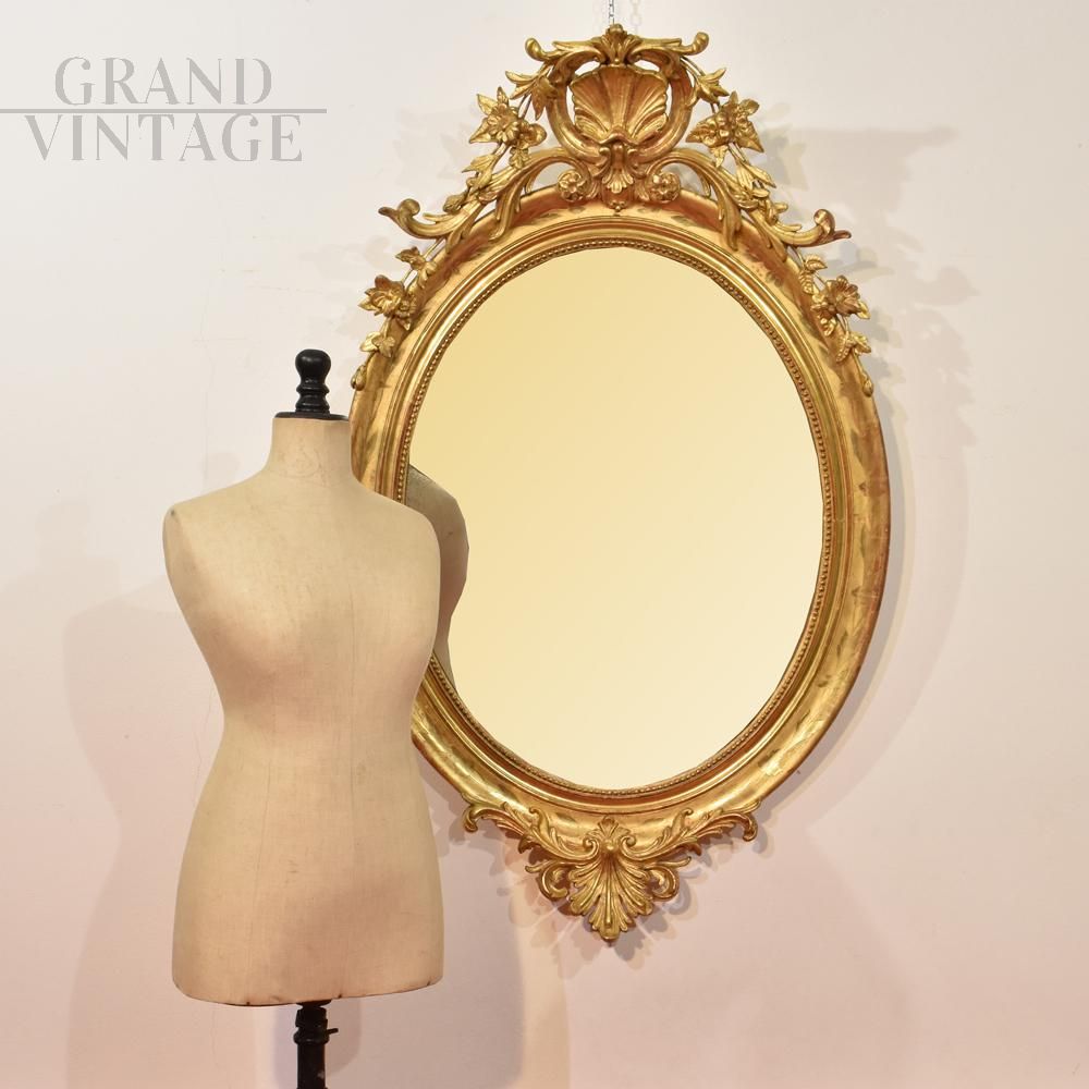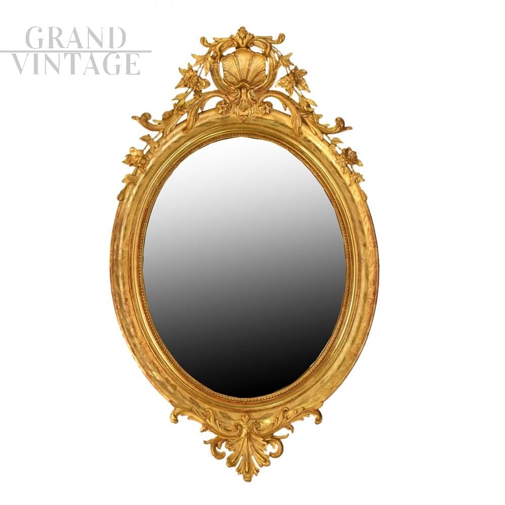 Questa antica specchiera ovale ha una cornice dorata in foglia d’oro zecchino. Lo specchio antico è al mercurio e la cornice che lo veste porta una doppia cimasa, quella superiore parte con una conchiglia per poi scendere con volute e fiori. Si tratta di uno specchio del 1800, XIX secolo, restaurato. Lo specchio e la schiena sono autentici e coevi tra loro. Lo specchio è restaurato a regola d'arte.