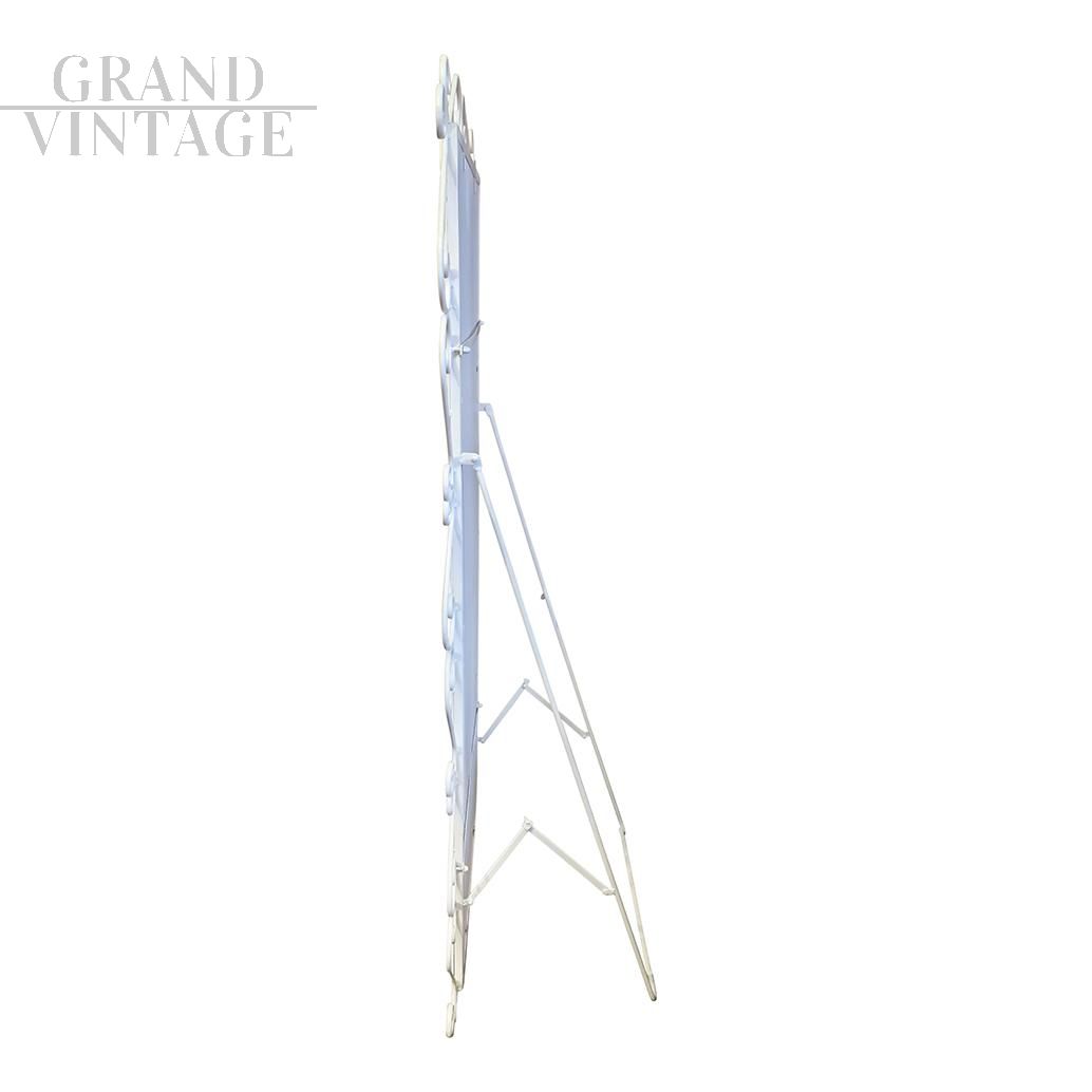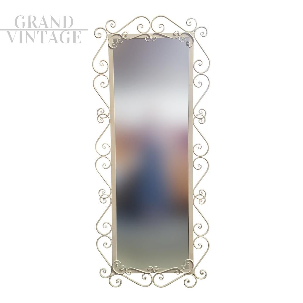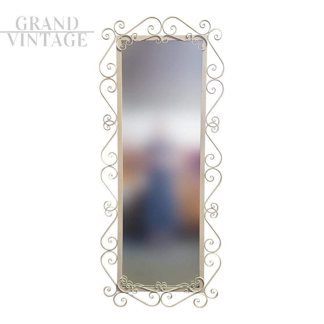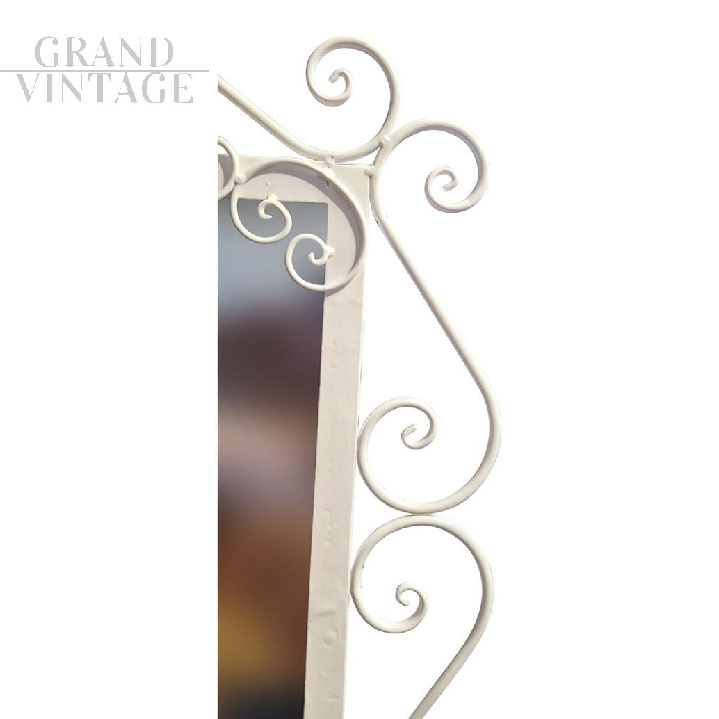 Specchiera da terra rettangolare con cornice in metallo decorato con riccioli e dipinto in color avorio, completo di appoggio per regolare l'inclinazione dello specchio.