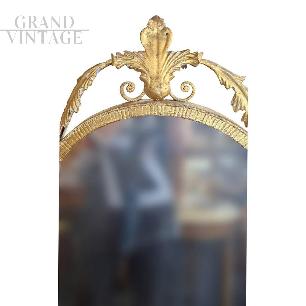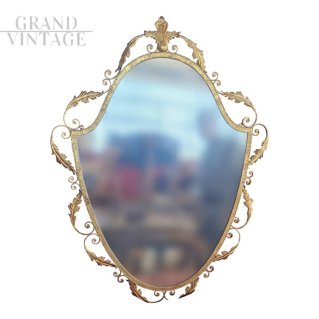 Elegante specchiera liberty a scudo con cornice in ottone dorato finemente lavorata con foglie e riccioli dorati.