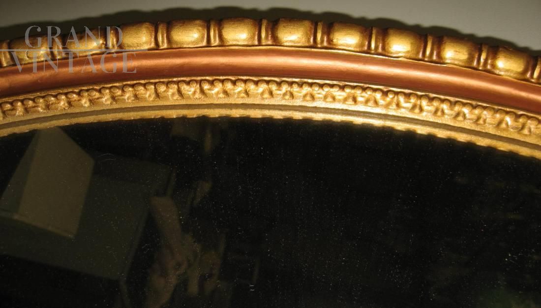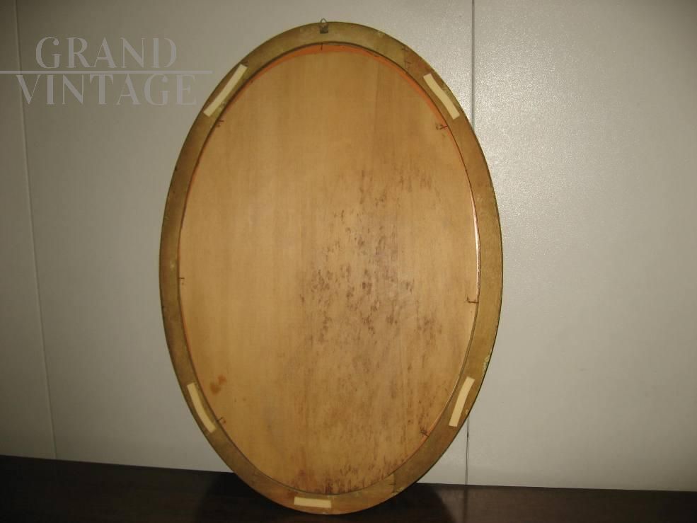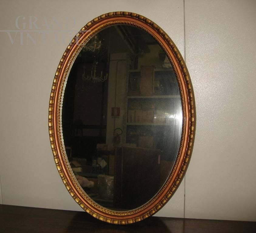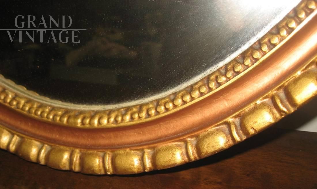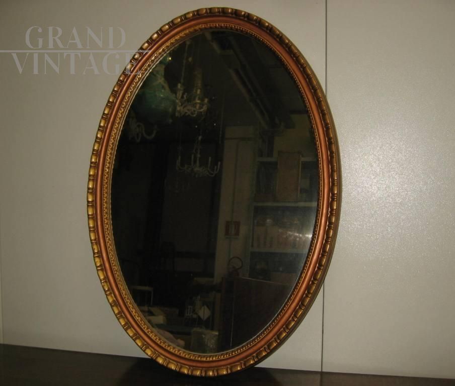 Specchiera vintage con cornice ovale in legno finemente intagliata dorata e decorata con laccatura color rame. Stile Ottocentesco, vintage anni '70, completa di specchiera. Ottime condizioni generali.