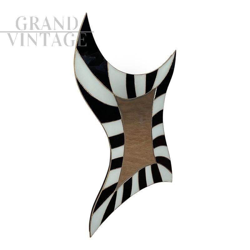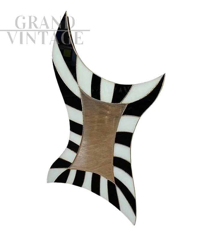 Specchiera specchio da parete sagomato interamente realizzato a mano con struttura in legno, finiture superficiali in tessere di vetro bianco e nero e profili in ottone dorato, completo di iluminazione con strip led a perimetro.