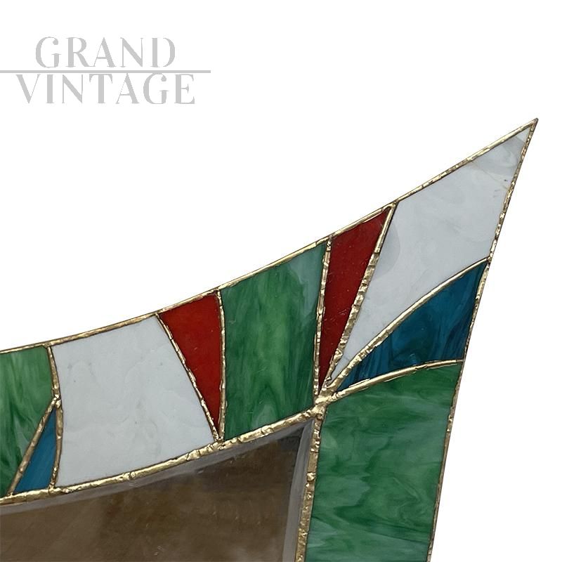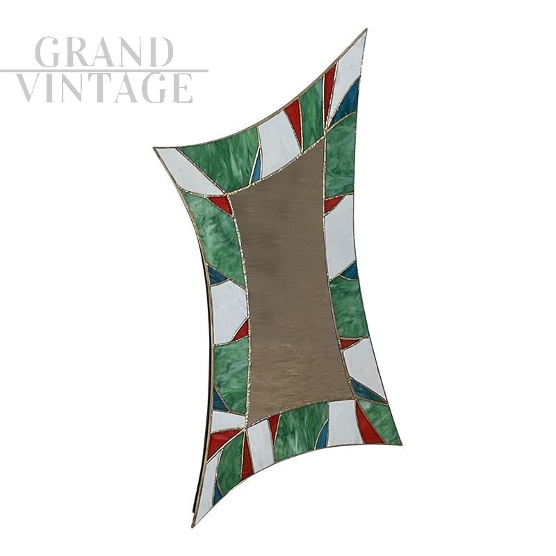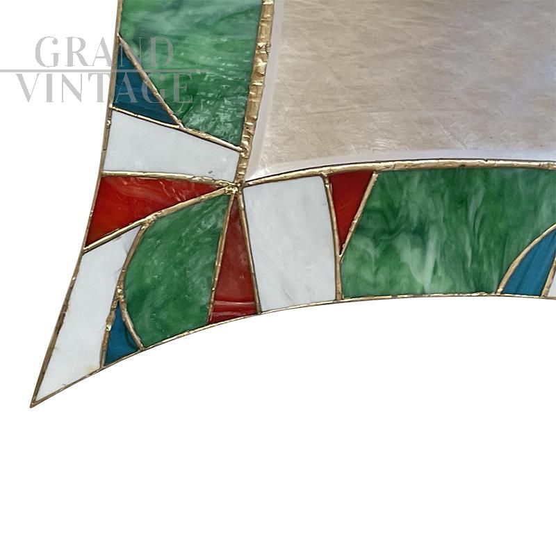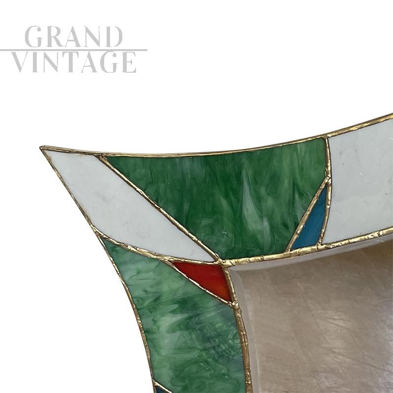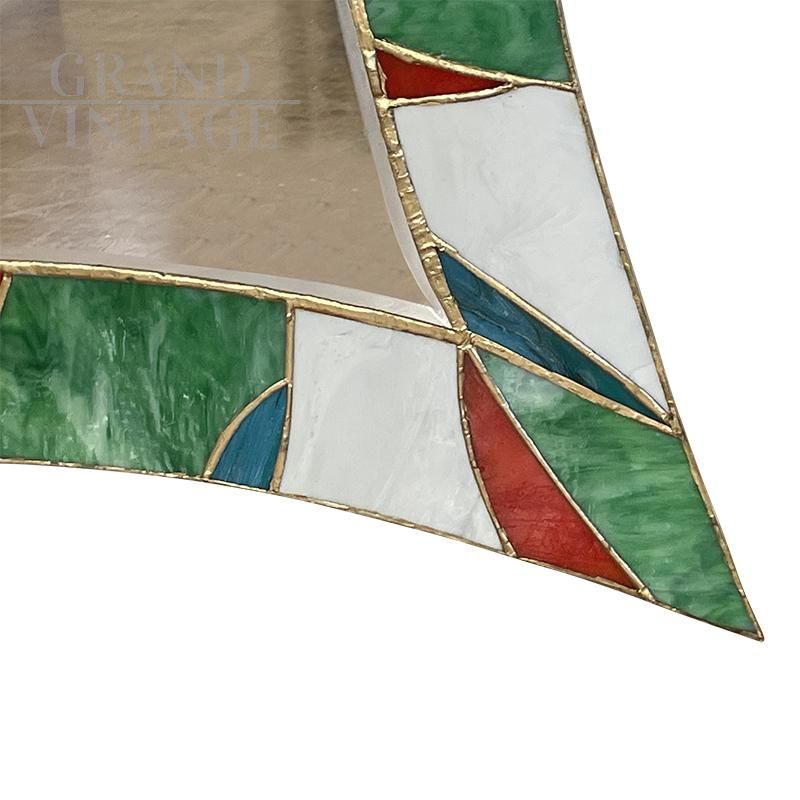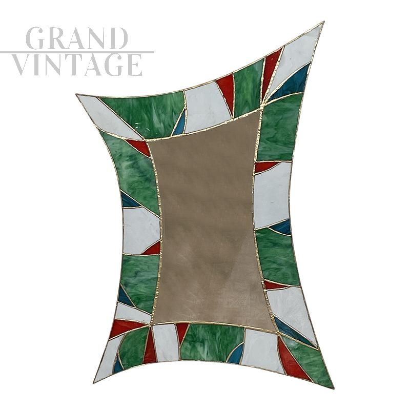 Specchiera specchio da parete design sagomato interamente realizzato a mano con truttura in legno, finiture superficiali in tessere di vetro colorato verde, rosso e blu, e con profili in ottone dorato, completo di illuminazione con strip led a perimetro.