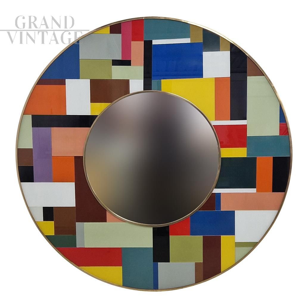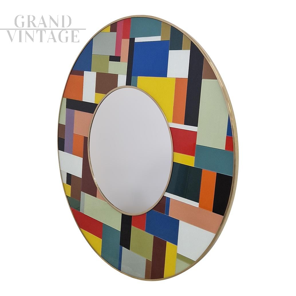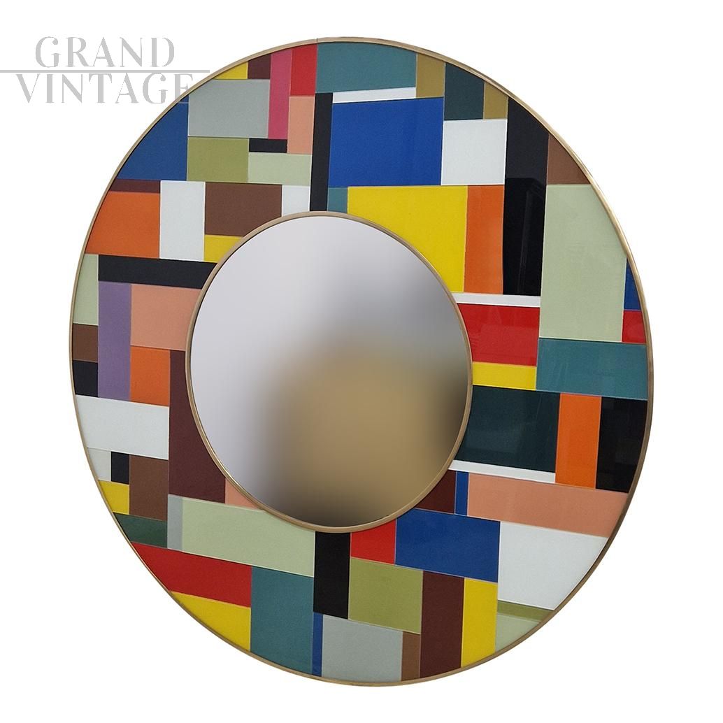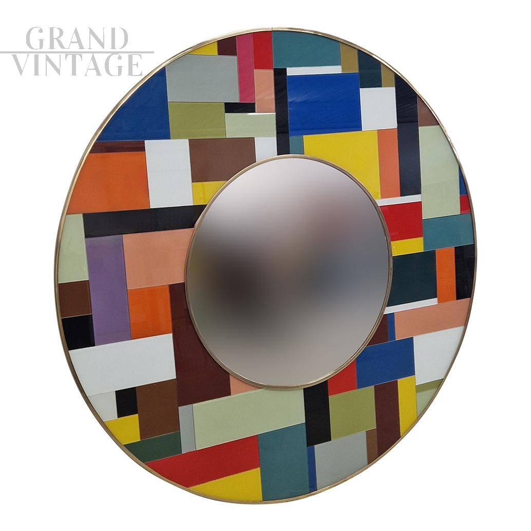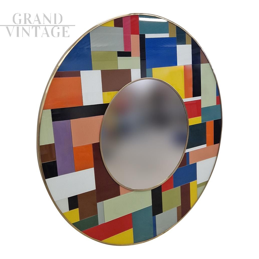 Specchiera con struttura in legno rotonda, rivestita in tessere di vetro, interamente realizzata a mano, profili in ottone dorato.