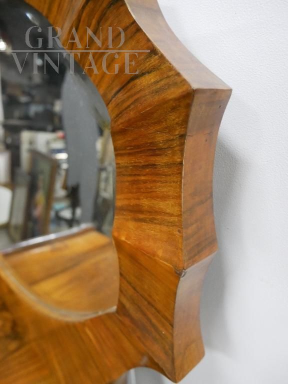 Specchiera vintage anni '30 da appoggio in legno sagomato, perfetta da poggiare su un comò o su una credenza. La cornice è in noce sagomato, lo specchio è molato, modello "a raggiera". Provenienza Nord Italia anni '30. In ottimo stato, in patina ma non restaurato.