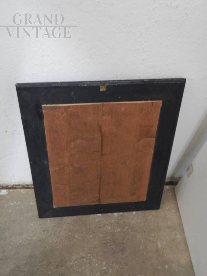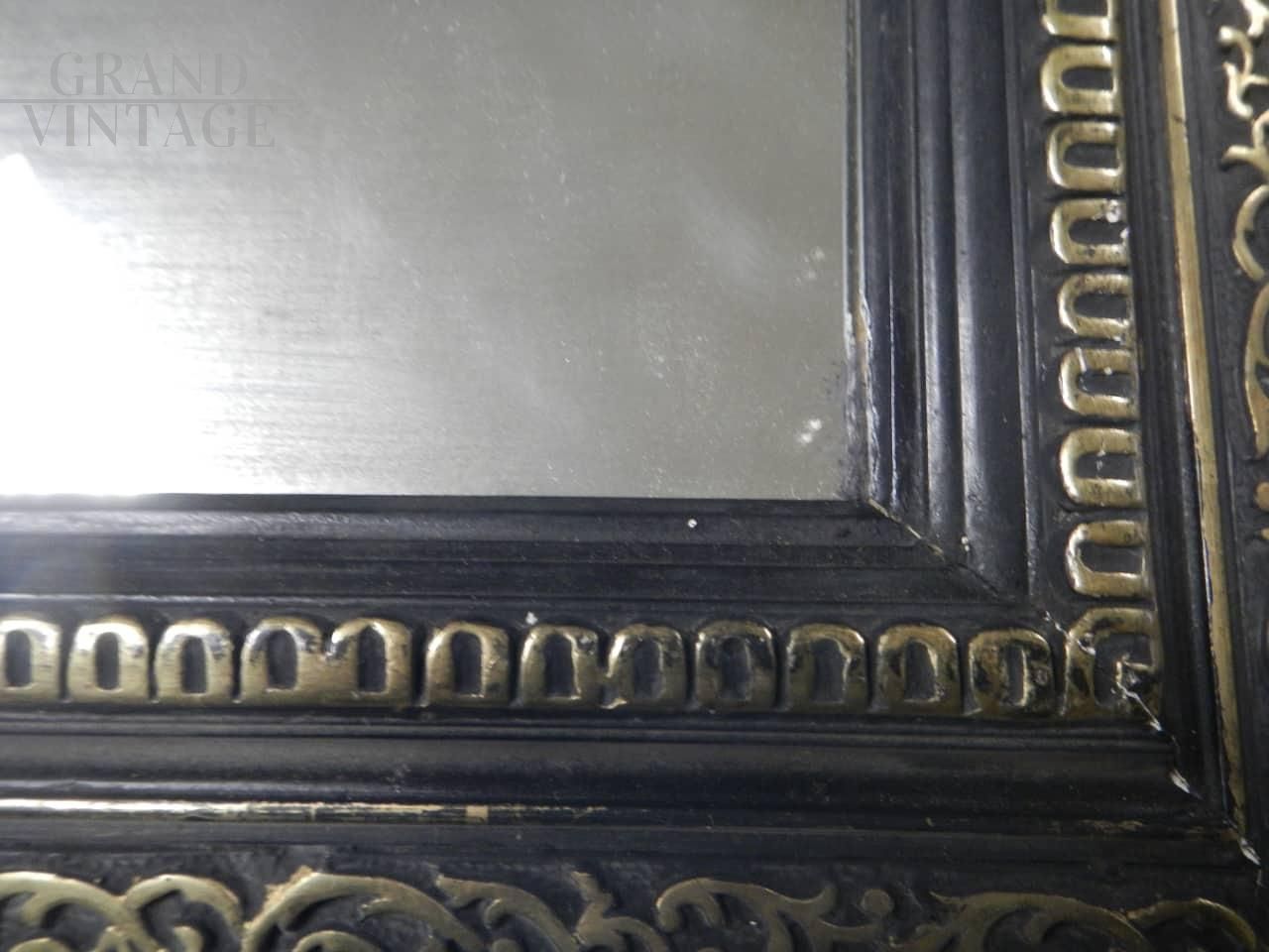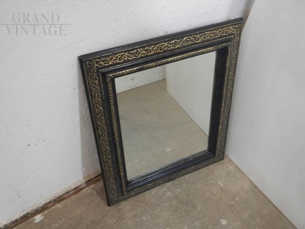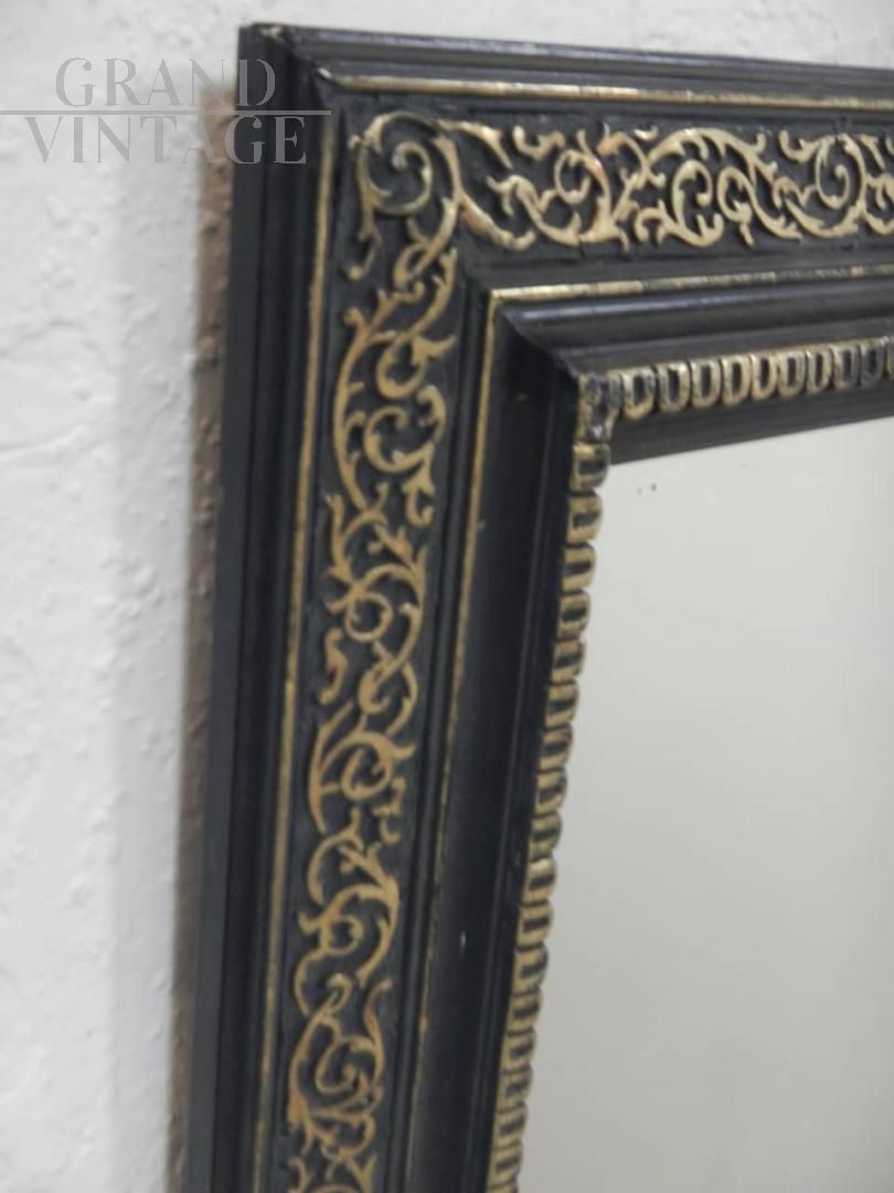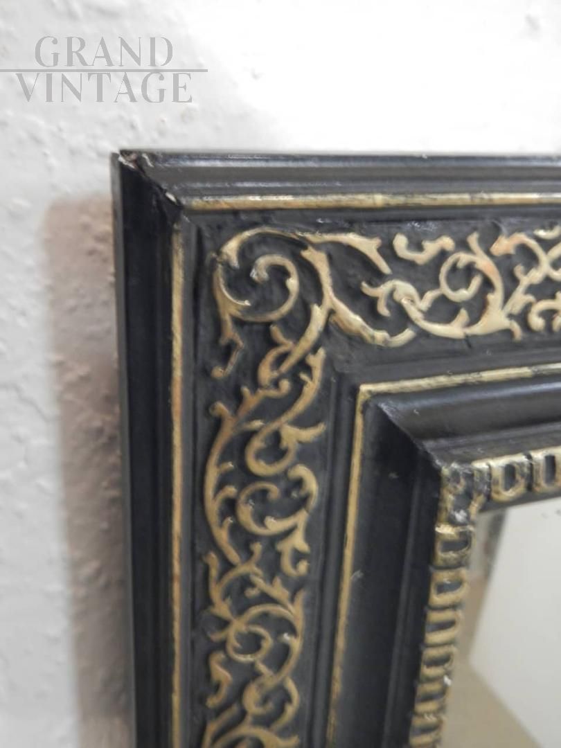 Specchio vintage anni '20 con cornice intagliata in legno di tiglio laccato nero con decorazioni dorate, in buone condizioni, in patina originale.
