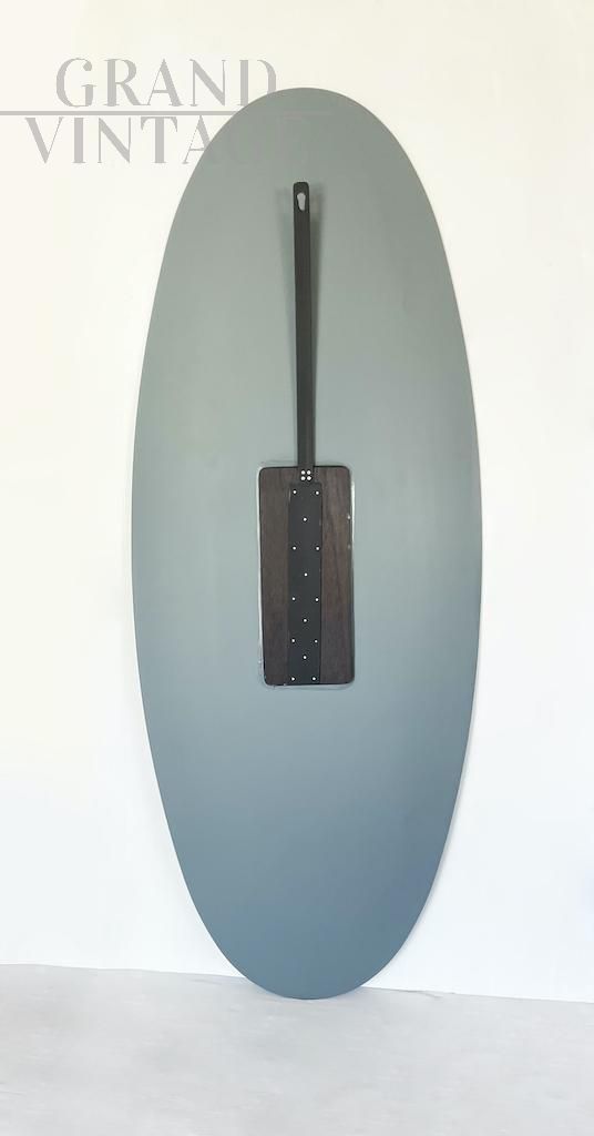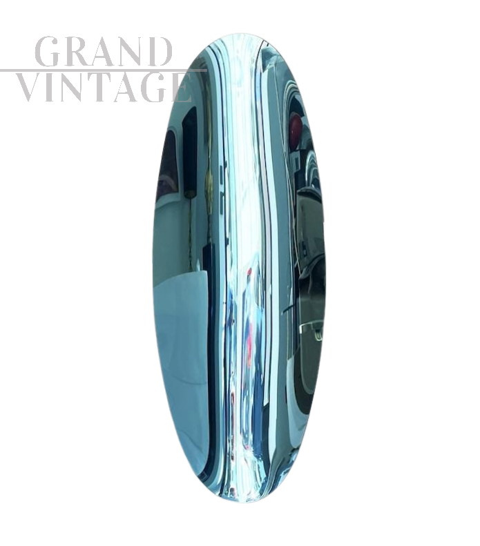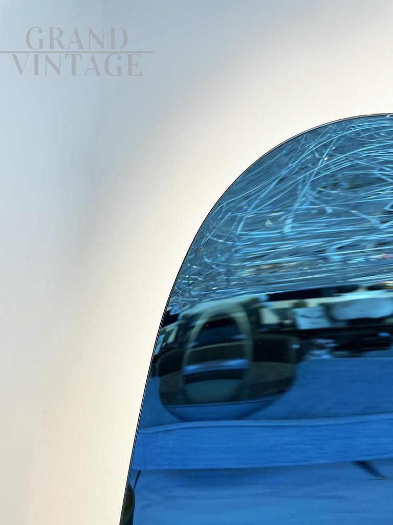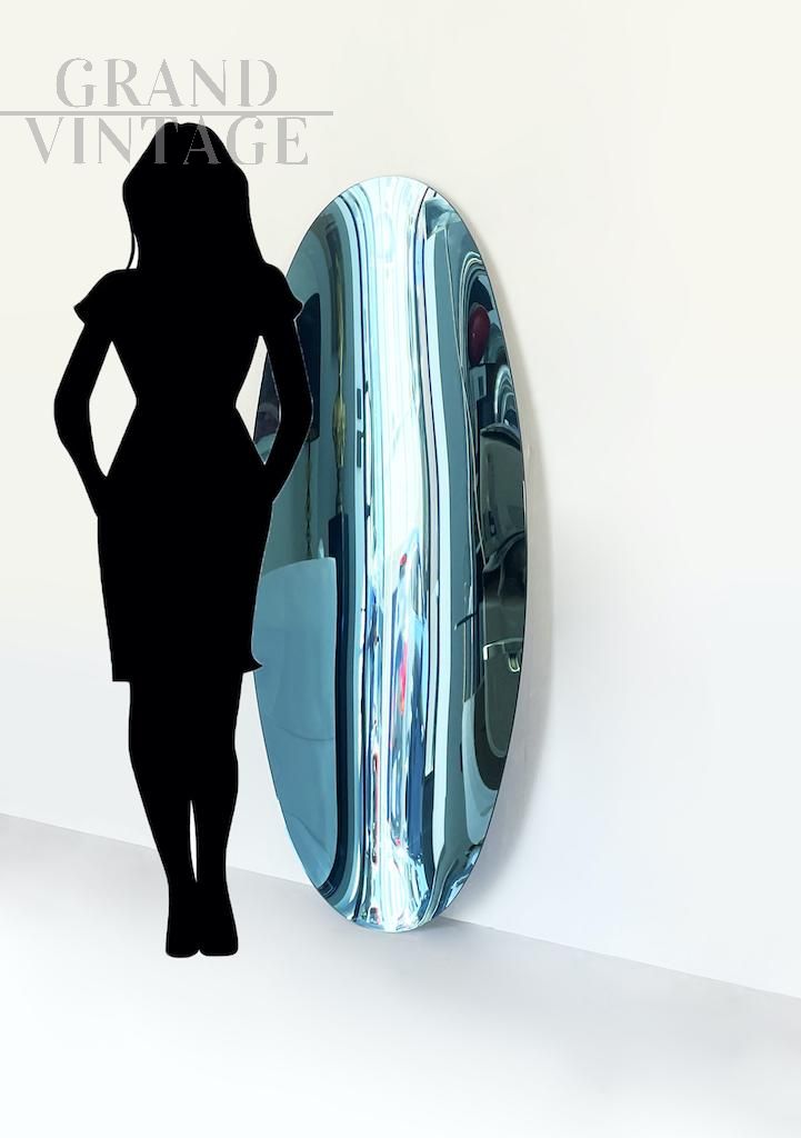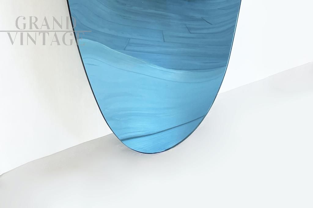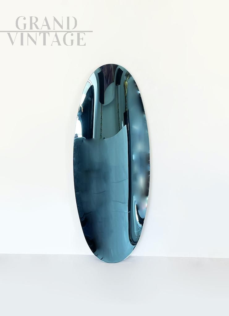 Particolare specchio blu a figura intera dalla forma a ovale allungato con una caratteristica curva concava al centro. Uno specchio che diventa oggetto d’arte e di design, in grado di restituire un effetto dalla profondità spaziale.