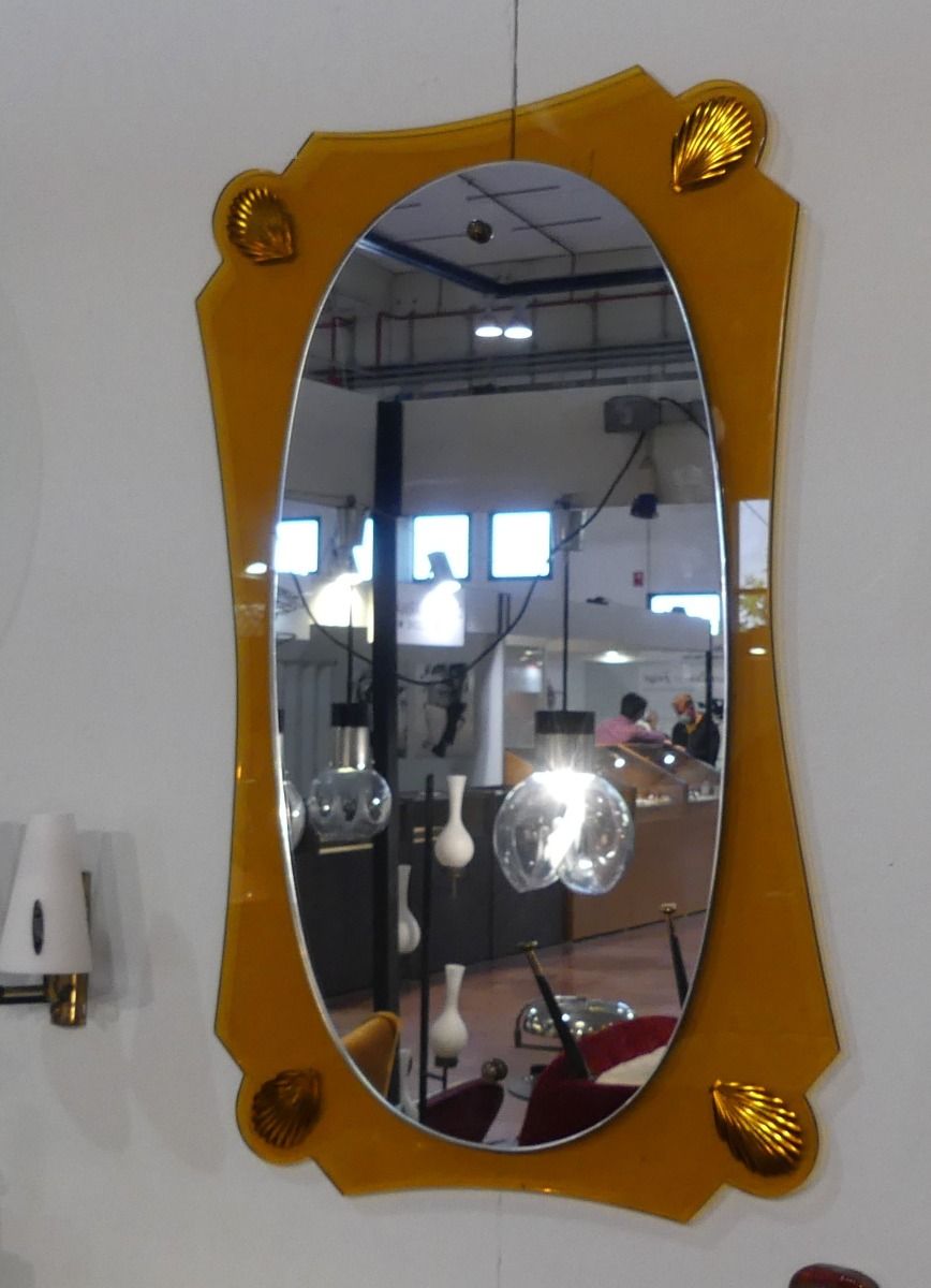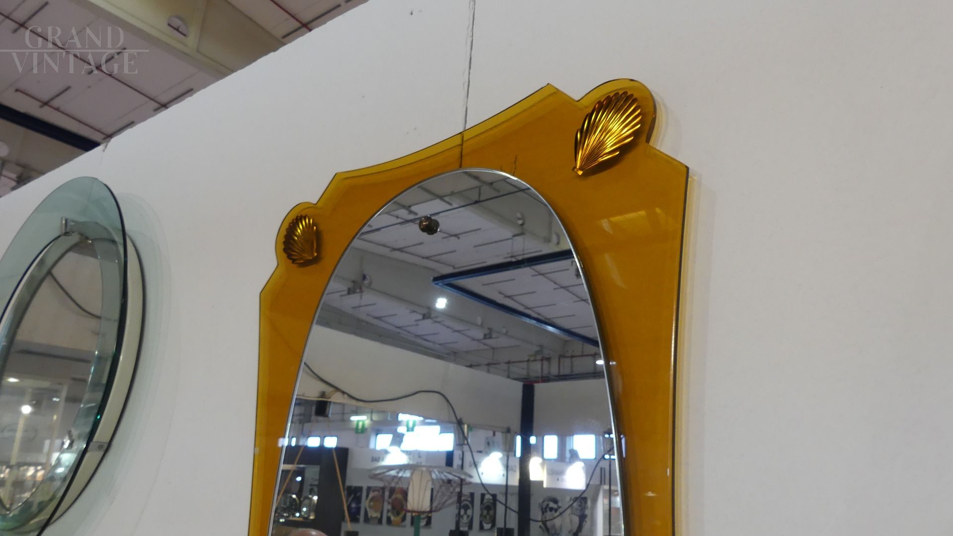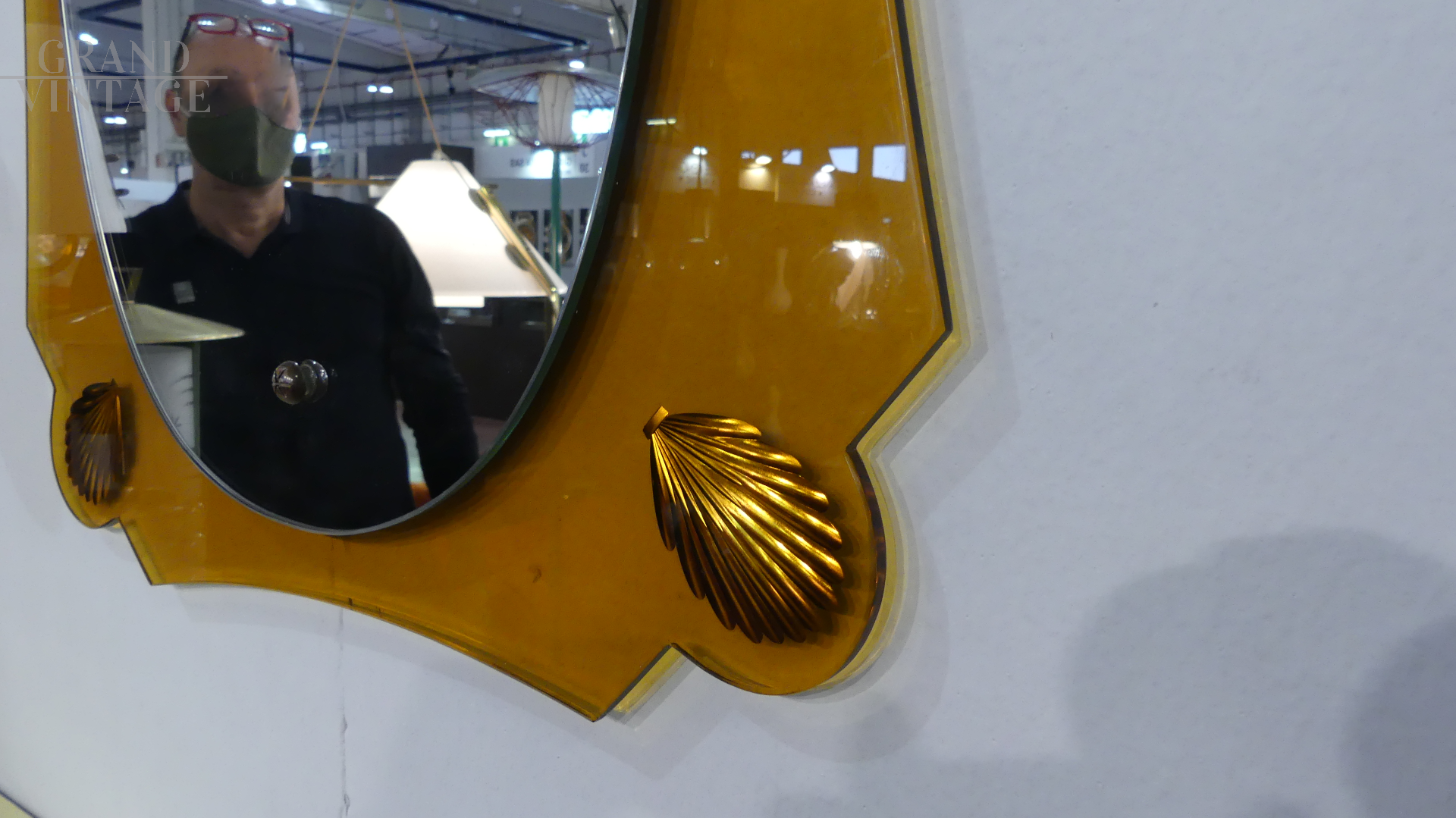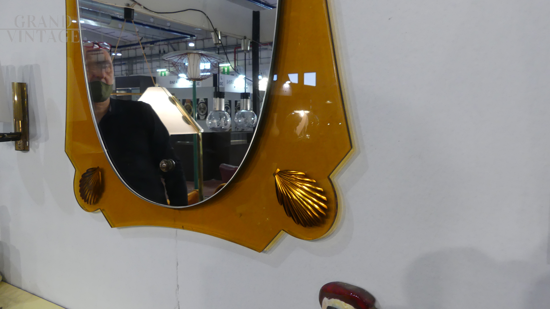 Questo bellissimo specchio vintage realizzato da Cristal Art intorno agli anni '60 poggia su una superficie in vetro color ambra, finemente intagliato ai 4 lati con motivi di conchiglie dipinte in oro nella parte incava. Uno specchio dalla bellezza particolare, può notevolmente migliorare l'aspetto di un ambiente.