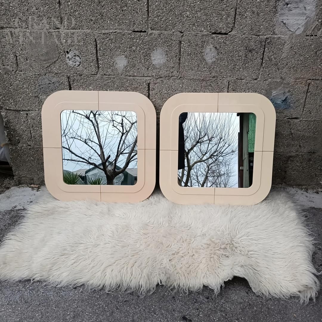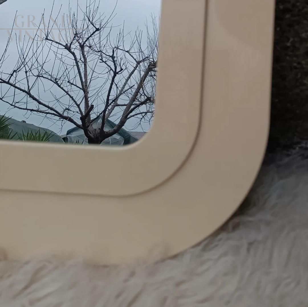 Specchio Kartell anni '70 di forma quadrata, disegnato da Anna Castelli Ferrieri e realizzato in plastica bianca con bellissima patina del tempo, formato da 4 moduli componibili, peculiarità di Anna Castelli Ferrieri, tenuti assieme solo da una levetta circolare e da alcuni fermi, posti sul retro, segno di semplicità e praticità del progetto. Misure 60 x 60 cm, utili del vetro 40 x 40 cm. Condizioni ottime.