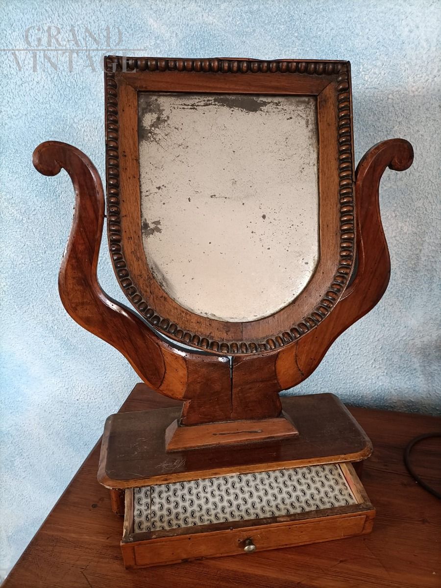 Specchiera da comò antica modello Psiche di fine '800 con cassettino porta gioie, completamente restaurata mantenendone le bellissime tracce del tempo sullo specchio originale al mercurio. Le misure riportate sono da considerare massime.