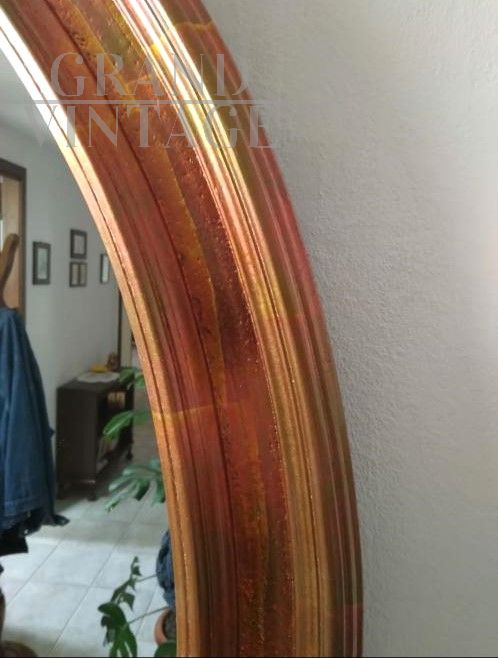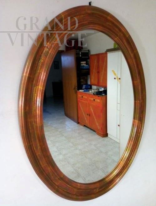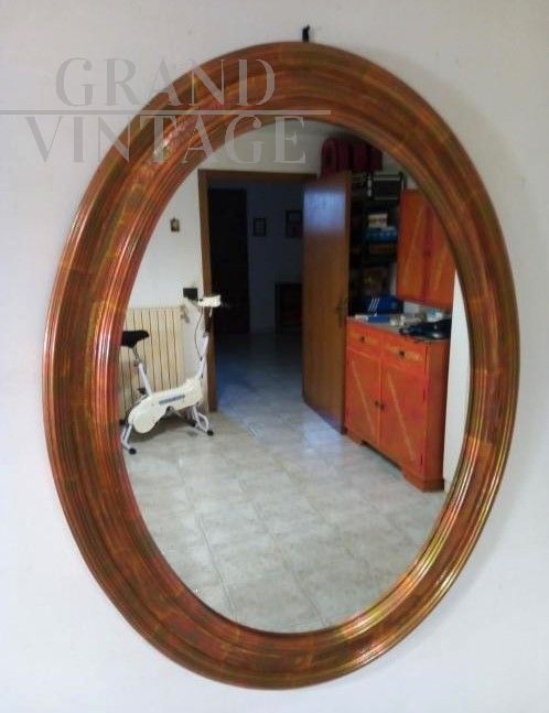 Specchio ovale vintage anni '70 in legno massiccio decorato in foglia oro e bronzo.