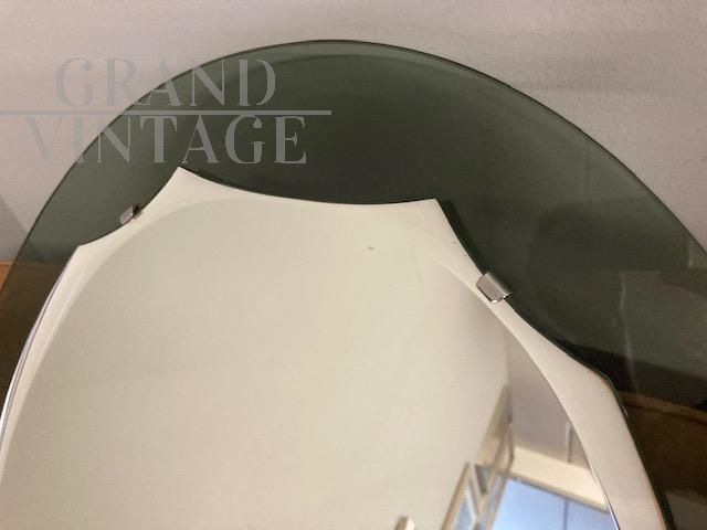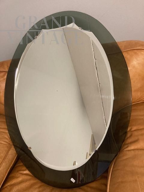 Specchiera modernariato ovale con fondo in vetro fumé verde e parte specchiata a rilievo dalla forma mossa, produzione originale manifattura italiana anni '60, in perfetto stato.