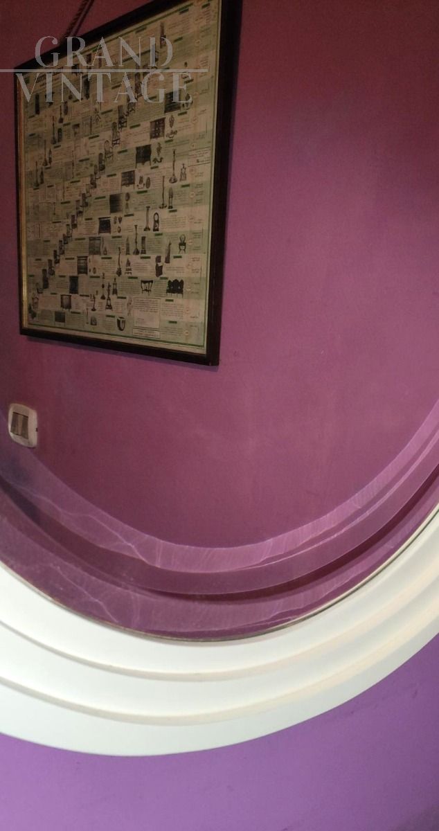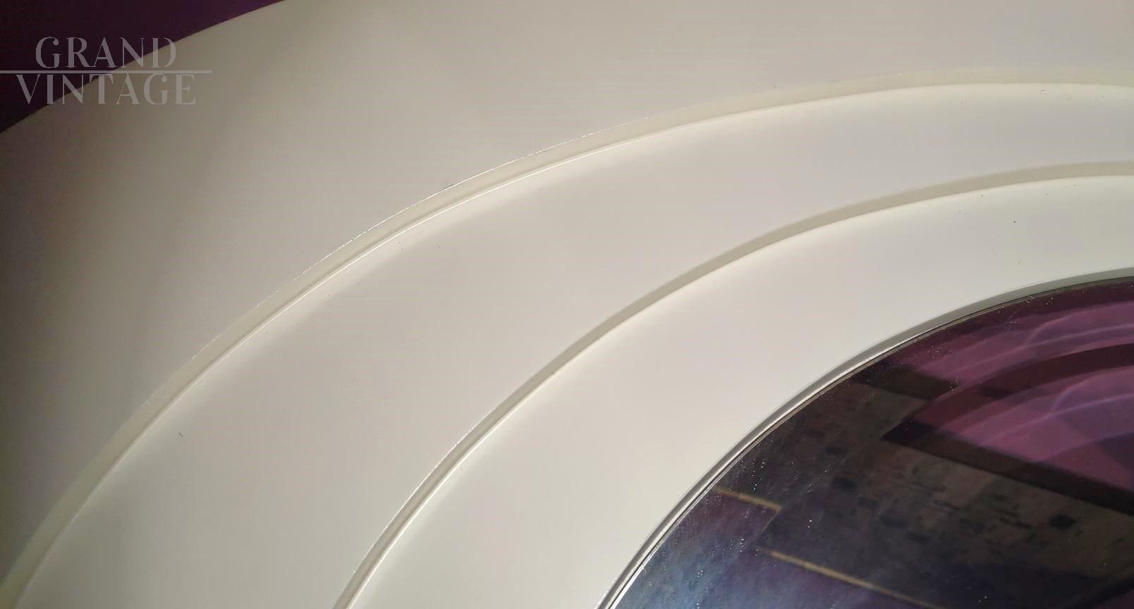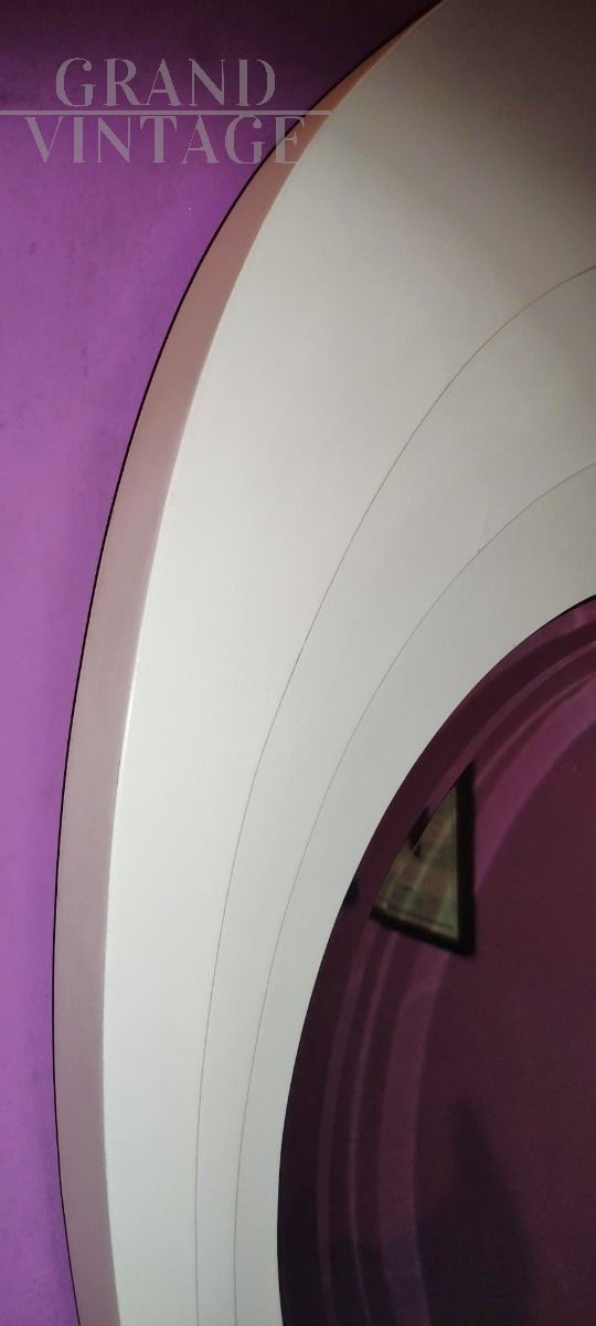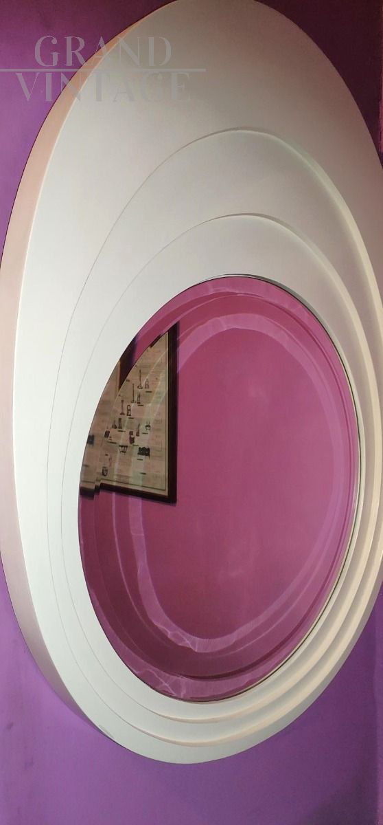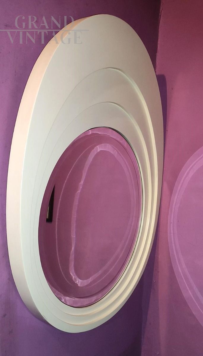 Specchio vintage Space Age italiano con cornice ovale in legno bianco con sezioni concentriche.