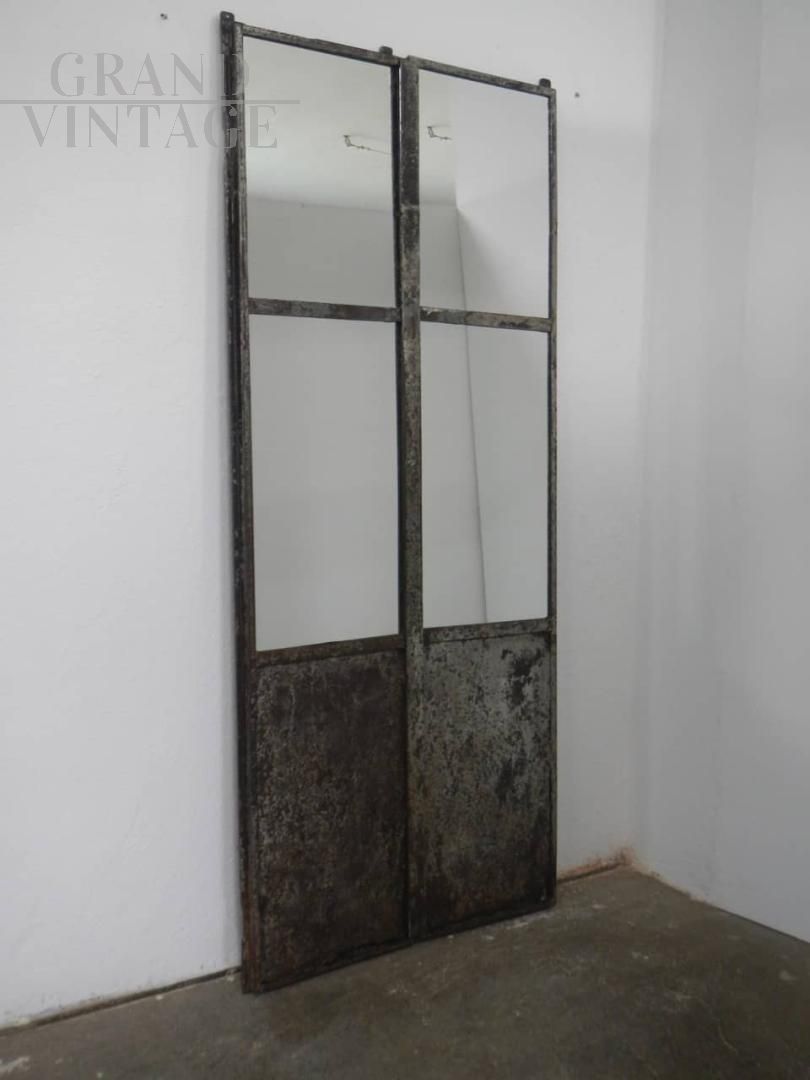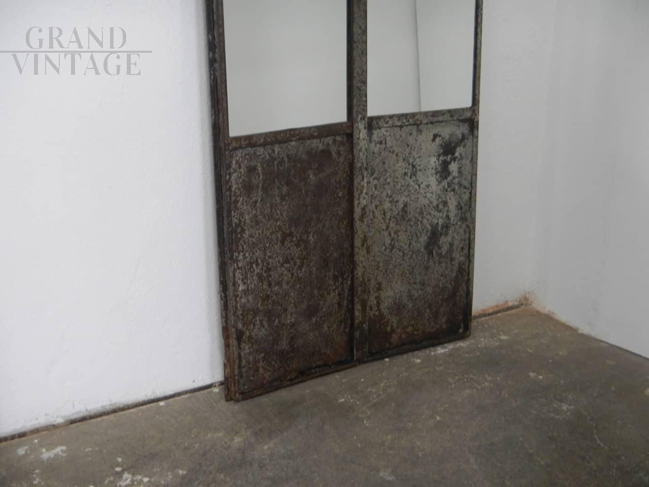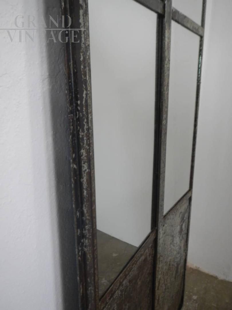 Porta industriale in ferro con specchio. La porta si divide in 2 pezzi assemblati da vite come da foto. Lo specchio misura cm 120 in altezza. Il ferro è stato pulito e trattato con vernice. I difetti sul lato inferiore sono stati lasciati per mantenere l’originalità della porta.