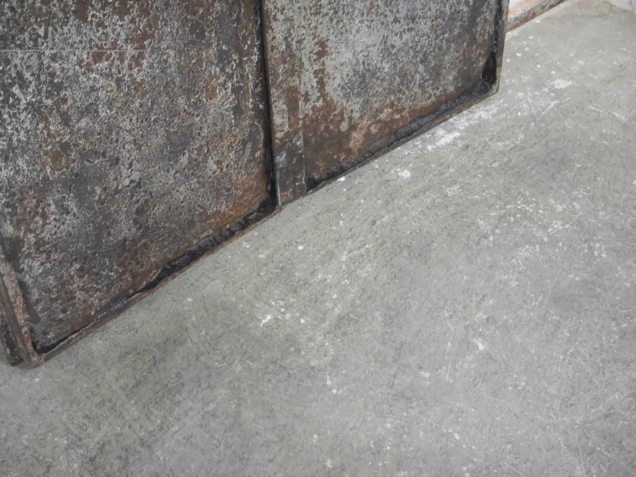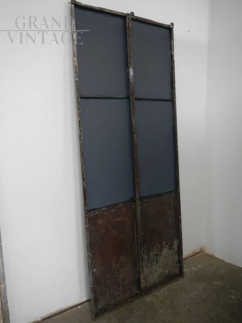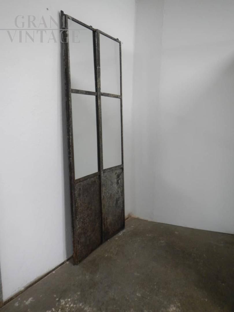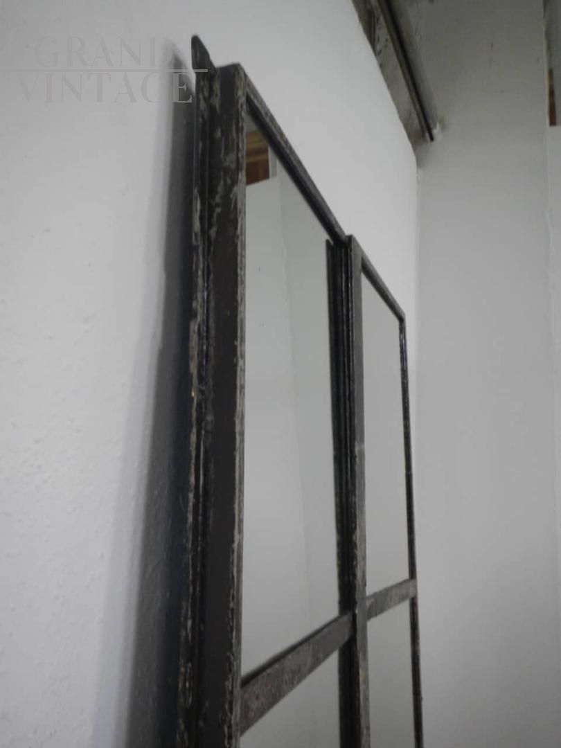 Porta industriale in ferro con specchio. La porta si divide in 2 pezzi assemblati da vite come da foto. Lo specchio misura cm 120 in altezza. Il ferro è stato pulito e trattato con vernice. I difetti sul lato inferiore sono stati lasciati per mantenere l’originalità della porta.