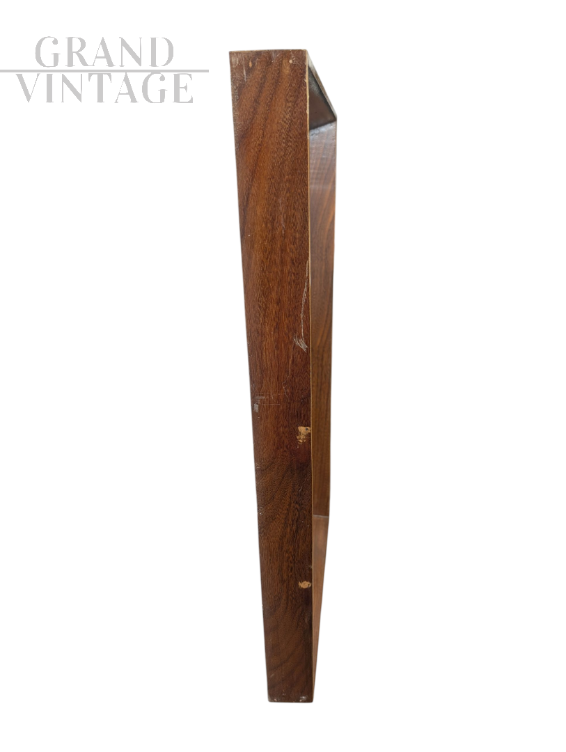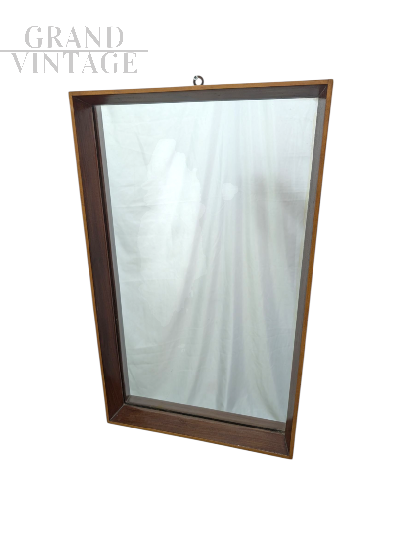 Questo elegante specchio vintage è incorniciato in pregiato legno teak, noto per la sua robustezza e le sue calde tonalità naturali. La cornice, dal design pulito con profilo leggermente inclinato verso l’interno, dona un tocco di sobria raffinatezza, perfetta per ambienti arredati in stile mid-century modern, classico o rustico. Il vetro riflettente è saldamente incastonato nella struttura in legno. Un gancio in metallo è fissato sulla parte superiore, pronto per il montaggio a parete. La cornice presenta alcuni segni del tempo, che testimoniano l’autenticità e la storia del pezzo, senza compromettere la sua bellezza o funzionalità.