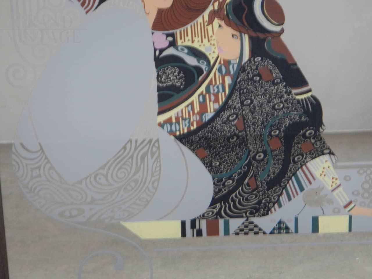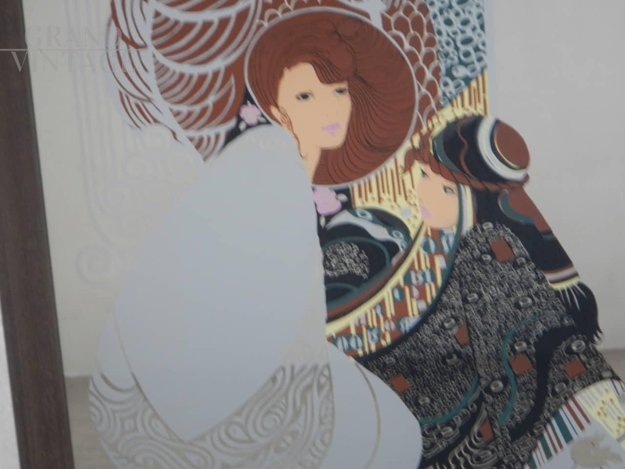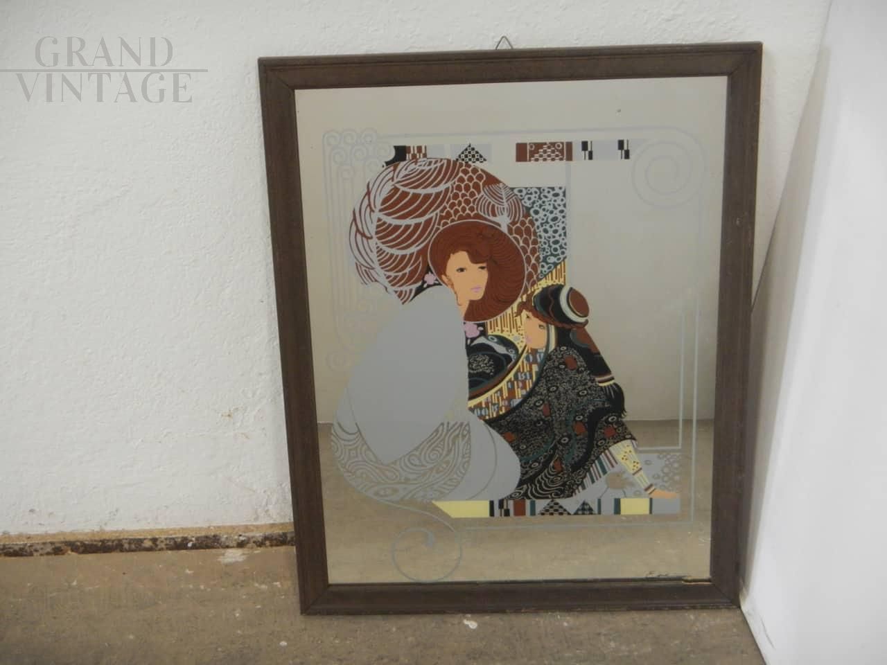 Specchio design di Saggers & Co. Ltd con disegno di donna e bambina stampato, Inghilterra 1979, completo di cornice in legno di abete. In buone condizioni, la cornice ha un difetto. Il retro è in legno compresso.