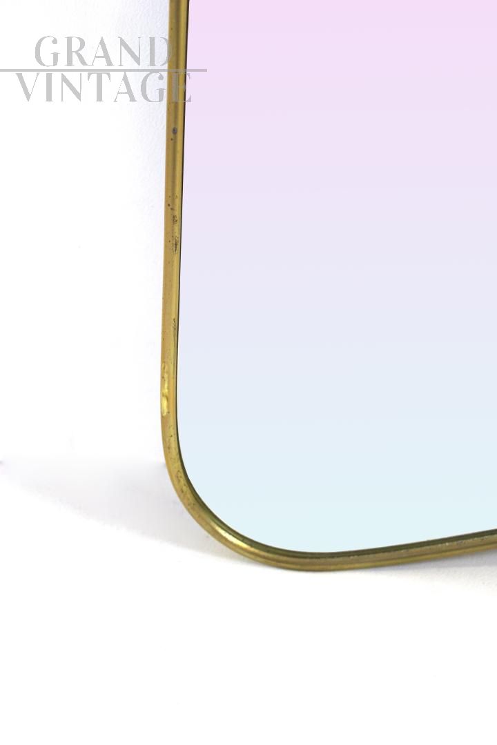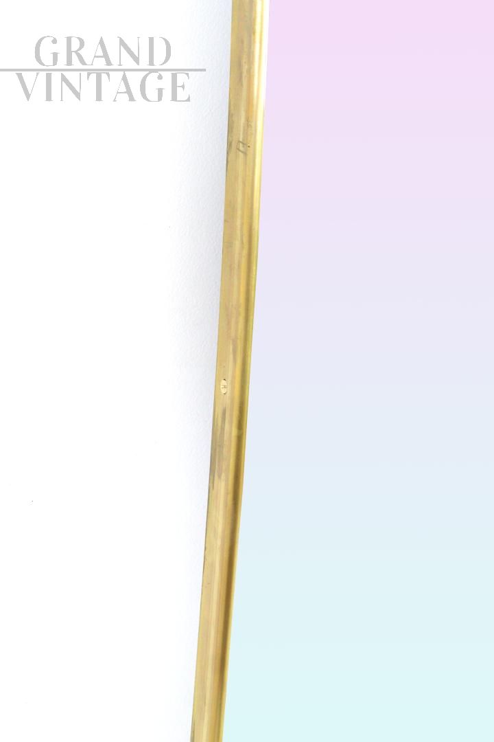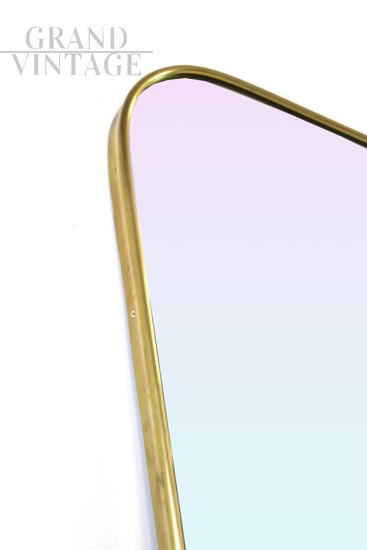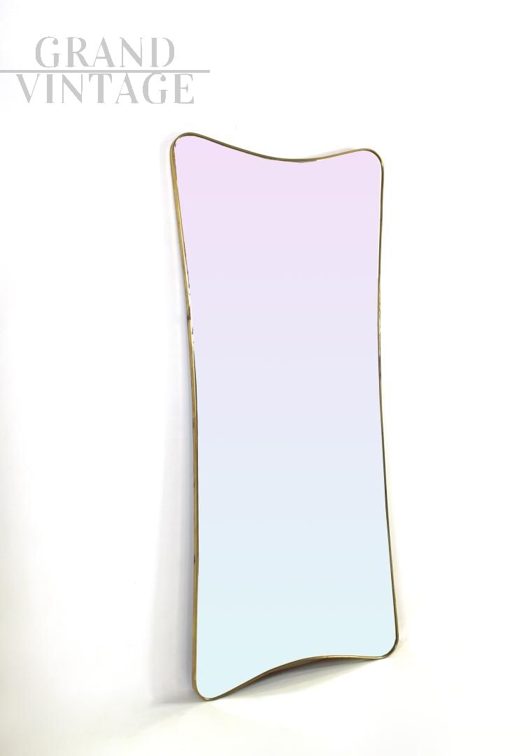 Elegante specchio design modernariato a figura intera dalla forma sagomata a biscotto, il profilo in ottone aggiunge un tocco di lusso e raffinatezza allo specchio creando un contrasto accattivante con il vetro pulito e chiaro. Epoca: Vintage 1970 Provenienza: Italia.