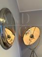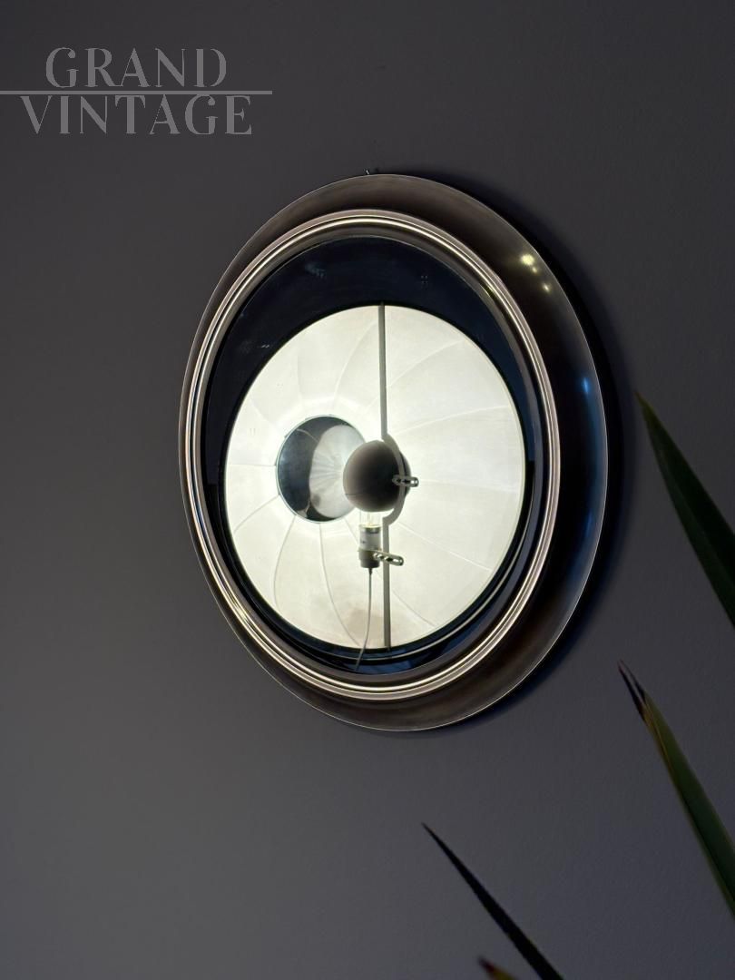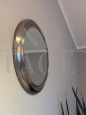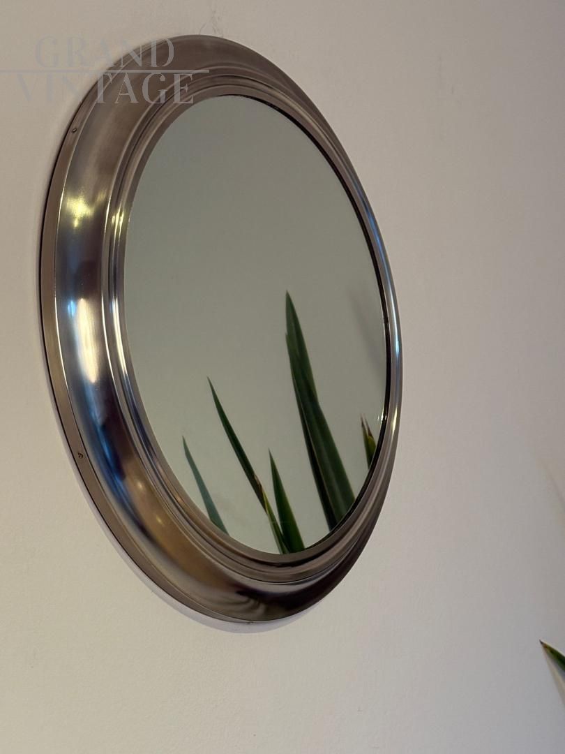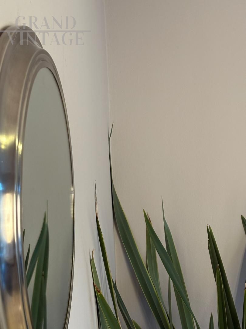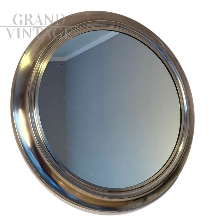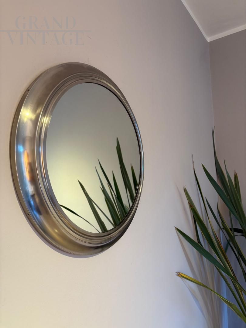 Specchio da parete vintage rotondo con cornice in acciaio risalente agli anni ’70. Il design è iconico e molto scenografico, perfetto per qualsiasi ambiente. Condizioni ottime, la cornice in acciaio gli conferisce un look solido e sofisticato.