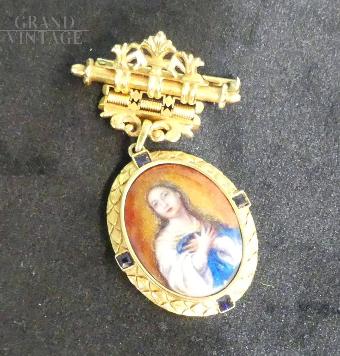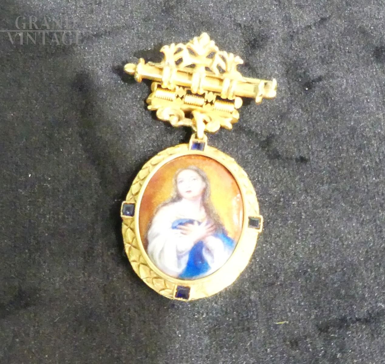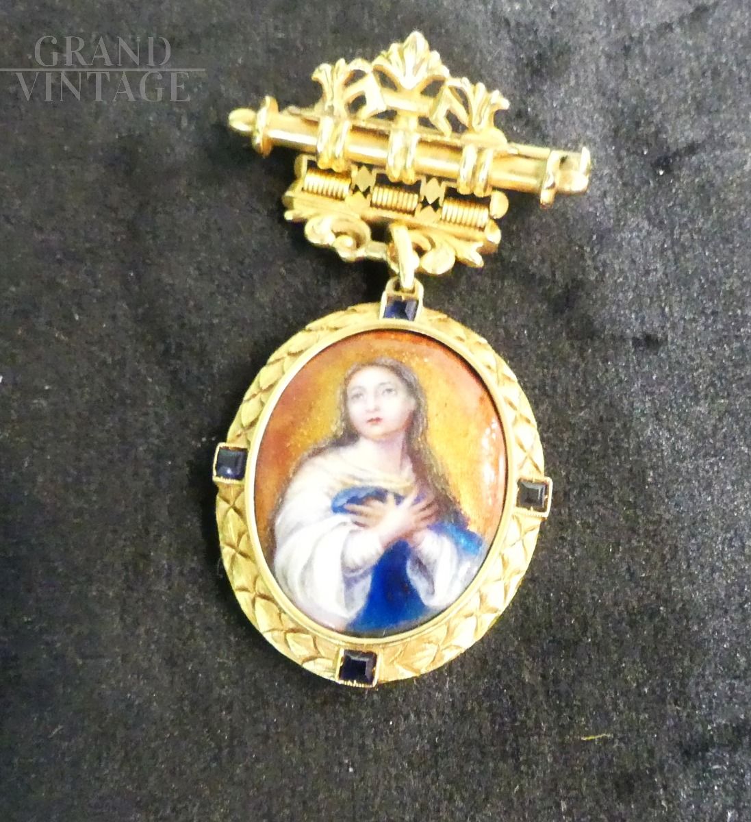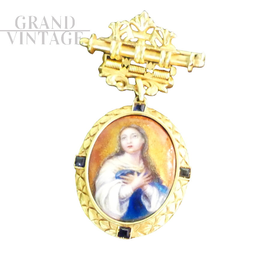 Magnifica spilla in oro 18 kt dipinta con smalti raffigurante la Madonna, il quattro lati dell'ovale presenta uno zaffiro. Sul retro, la spilla riporta l'incisione Immaculada Balselli.