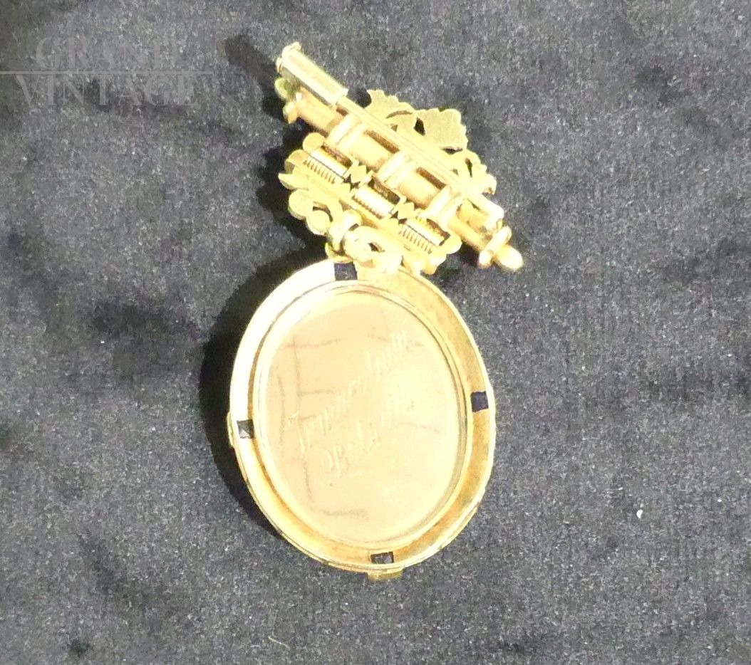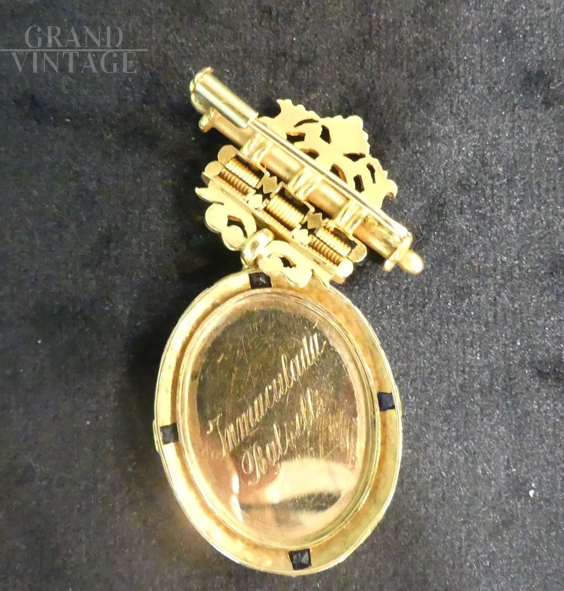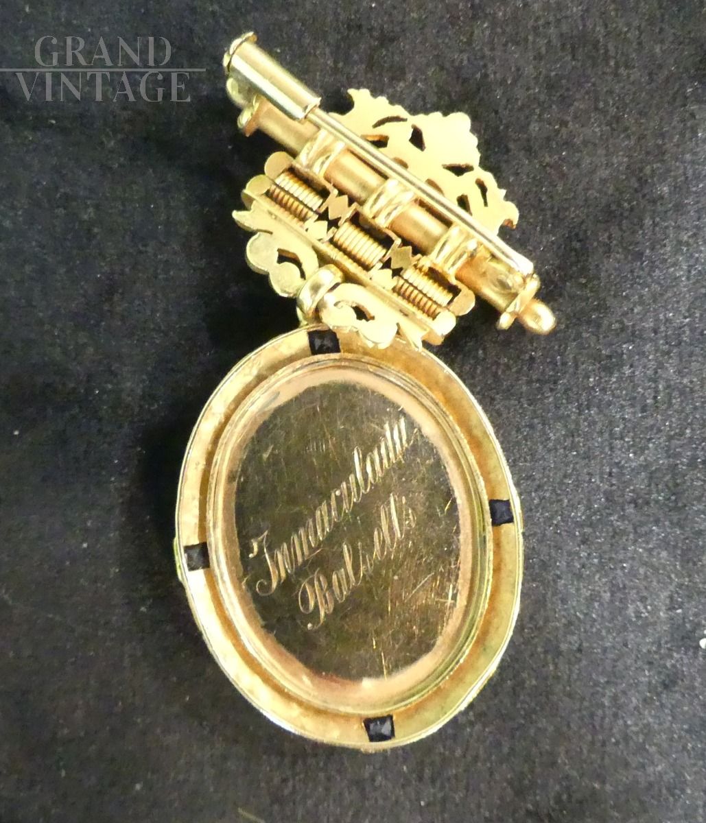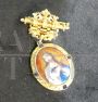 Magnifica spilla in oro 18 kt dipinta con smalti raffigurante la Madonna, il quattro lati dell'ovale presenta uno zaffiro. Sul retro, la spilla riporta l'incisione Immaculada Balselli.
