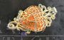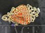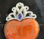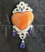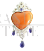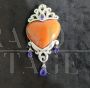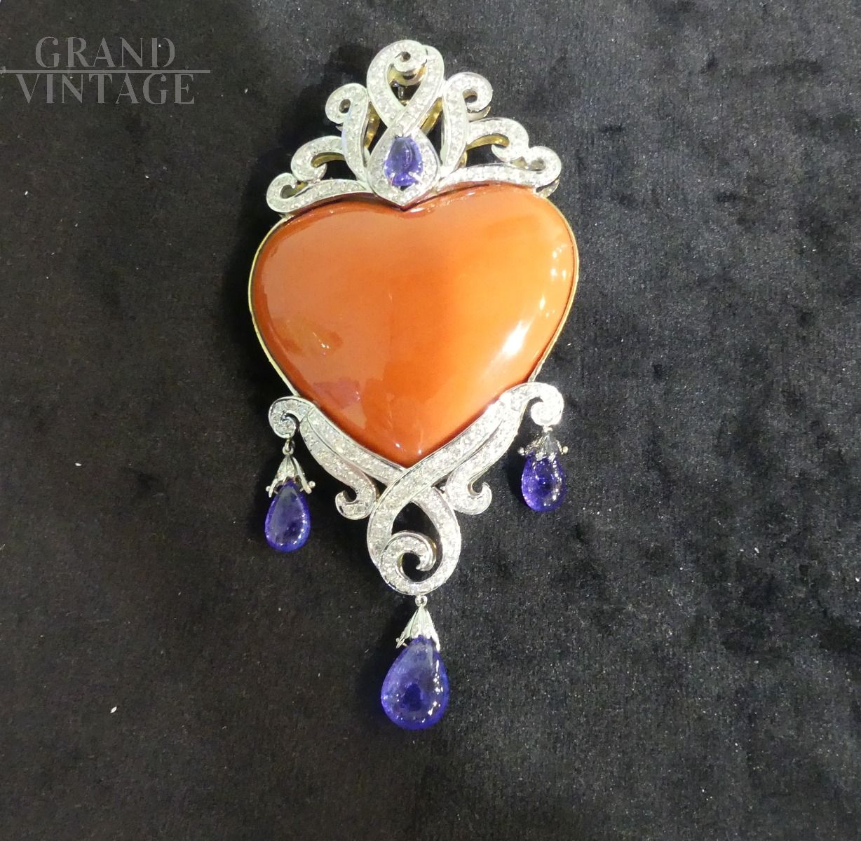 Spilla maxi in oro bianco con cuore di corallo, diamanti e tanzanite