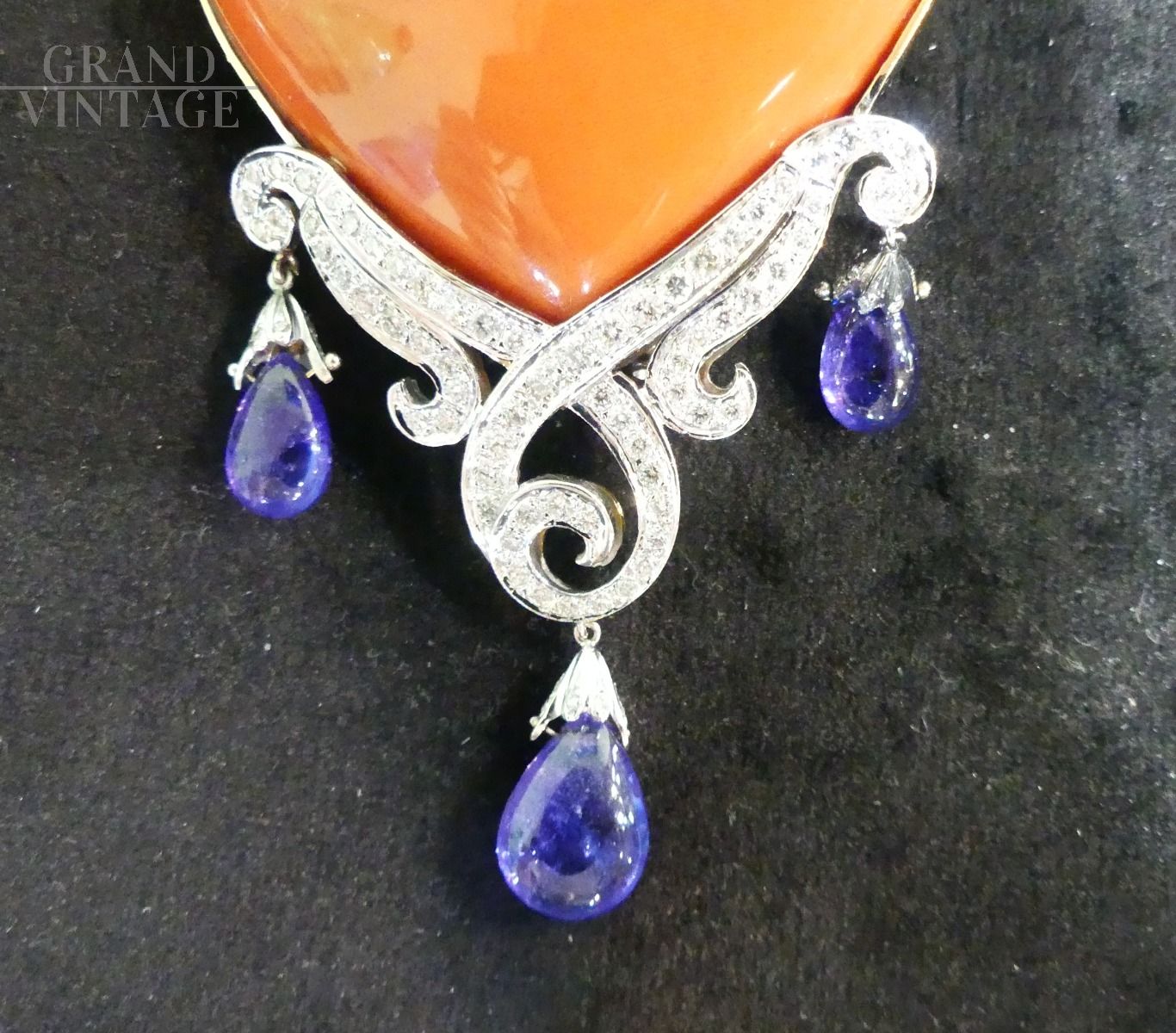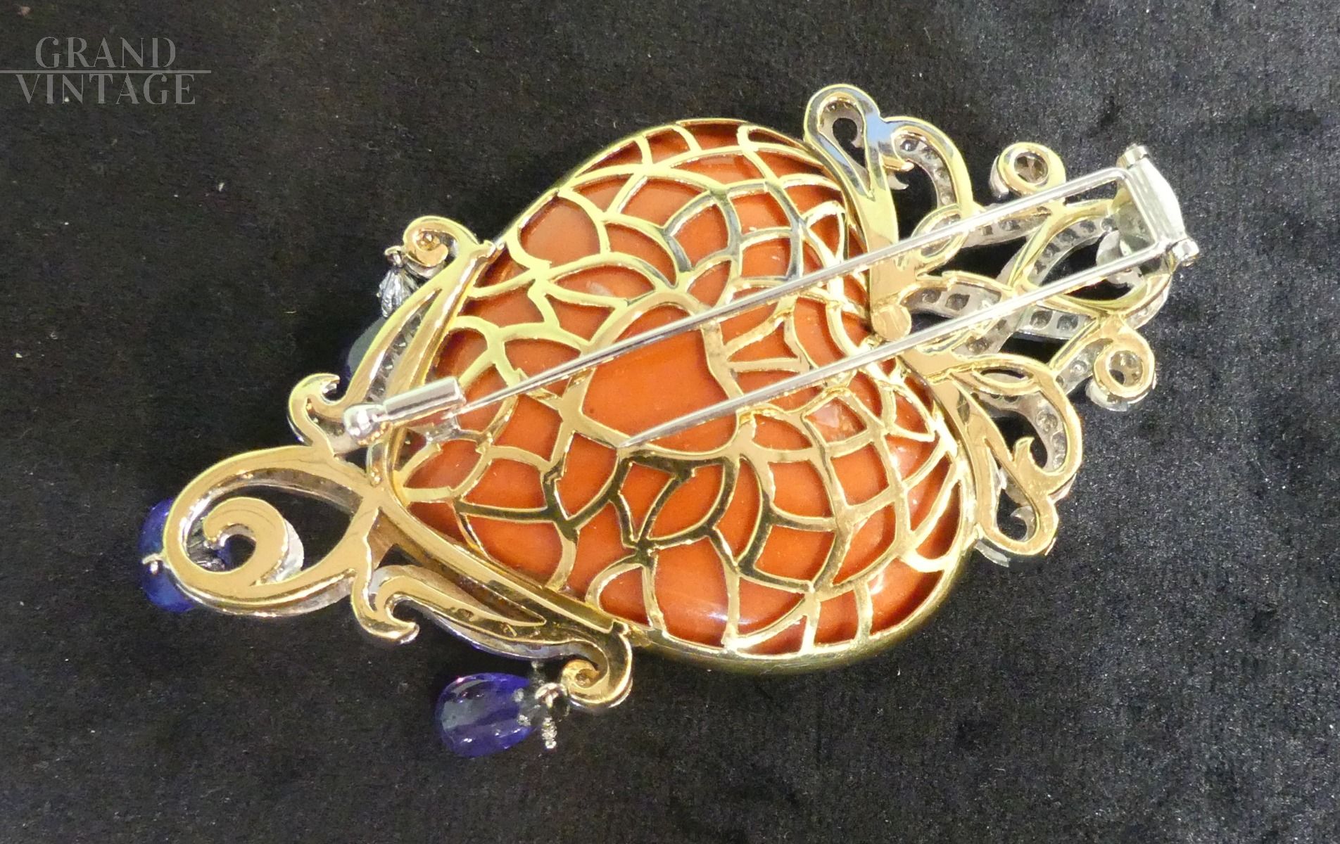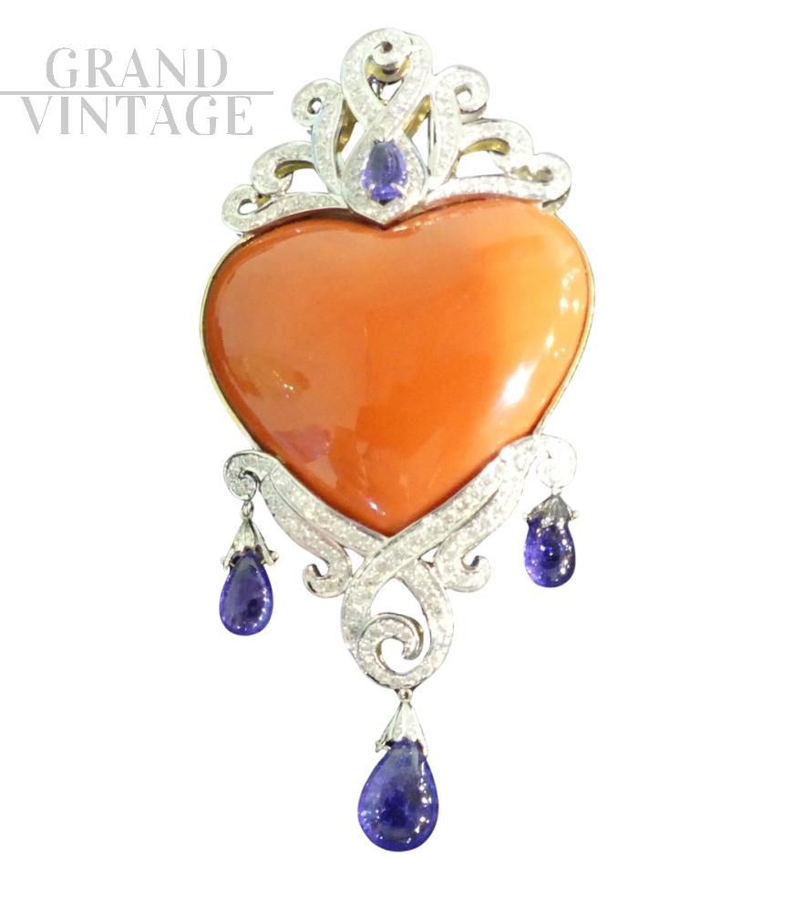 Maestosa spilla in oro bianco 18 kt con grande cuore in corallo, diamanti taglio brillante 3.36 carati e gocce in tanzanite 13 carati. La spilla è stata realizzata negli anni '90, da notare anche il magnifico lavoro sul retro della spilla. Il corallo ha un peso di 50 grammi, l'oro di 15.40 grammi. Un vero capolavoro.