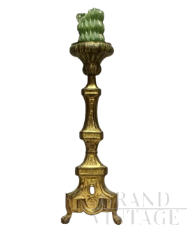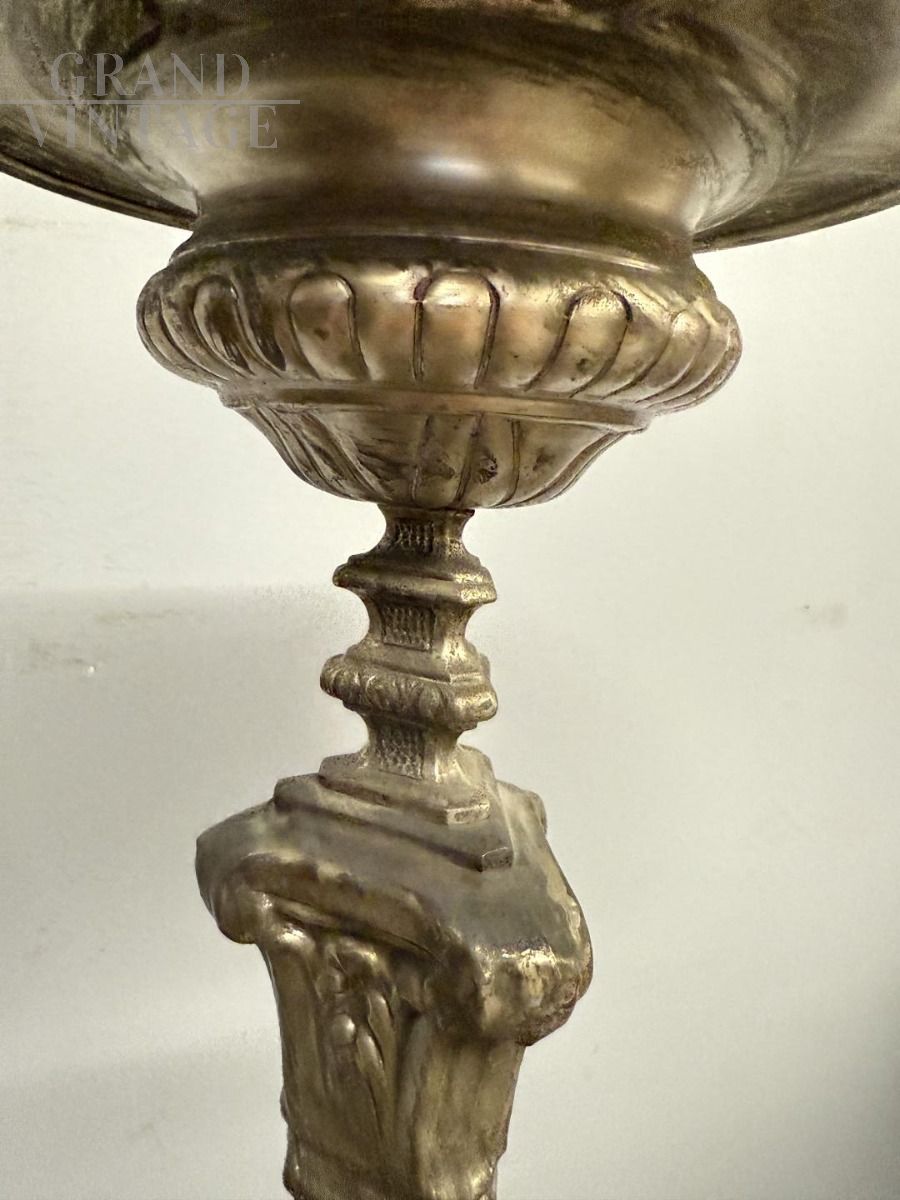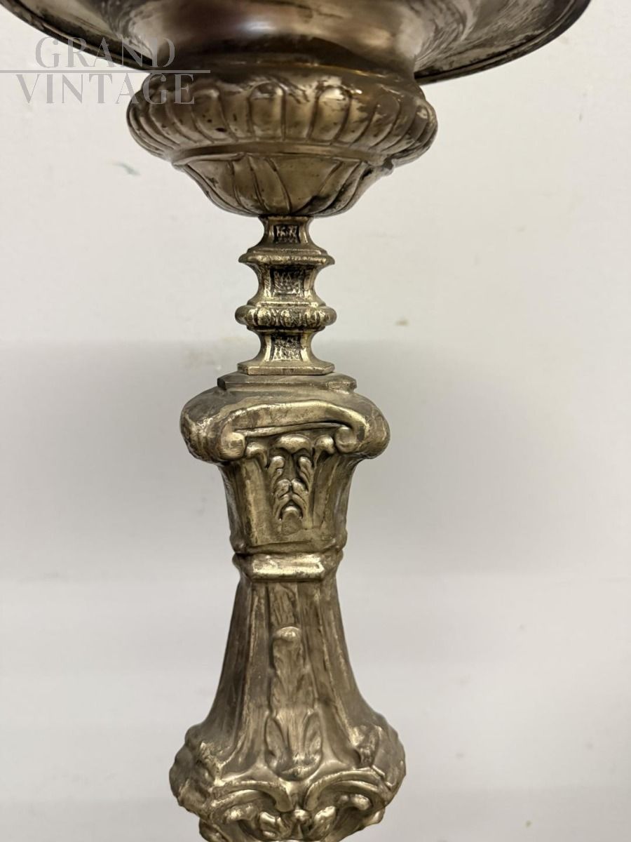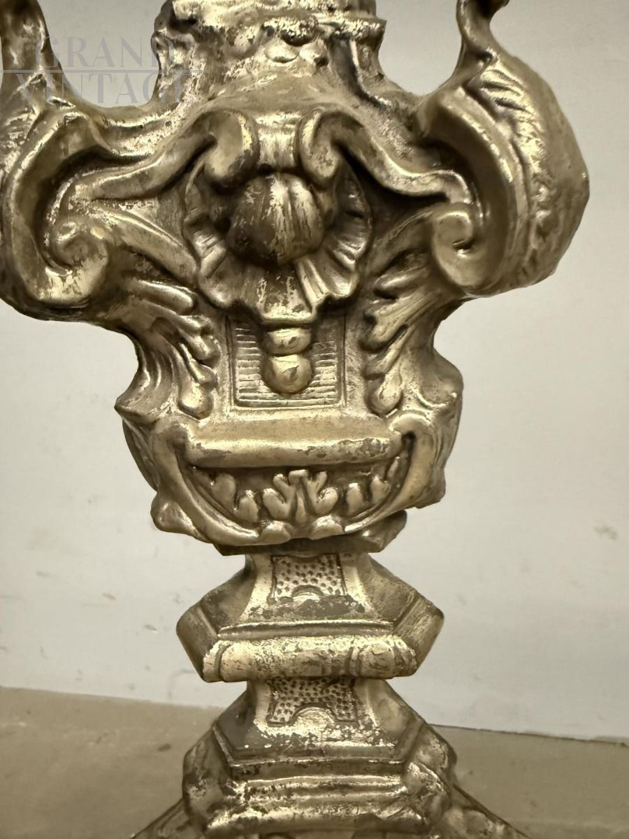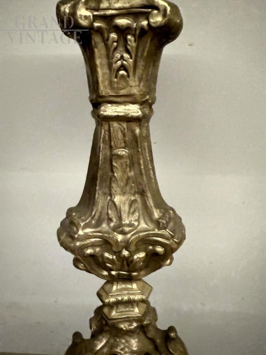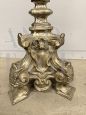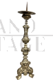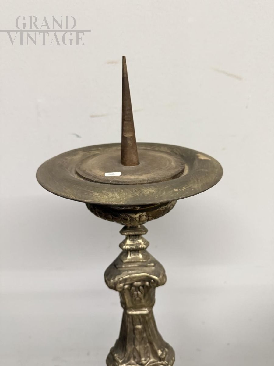 Splendido candeliere da chiesa antico del XVIII secolo in metallo argentato, 97 x 25 cm. Bellissima lavorazione a rilievo sbalzata. Stato molto buono.