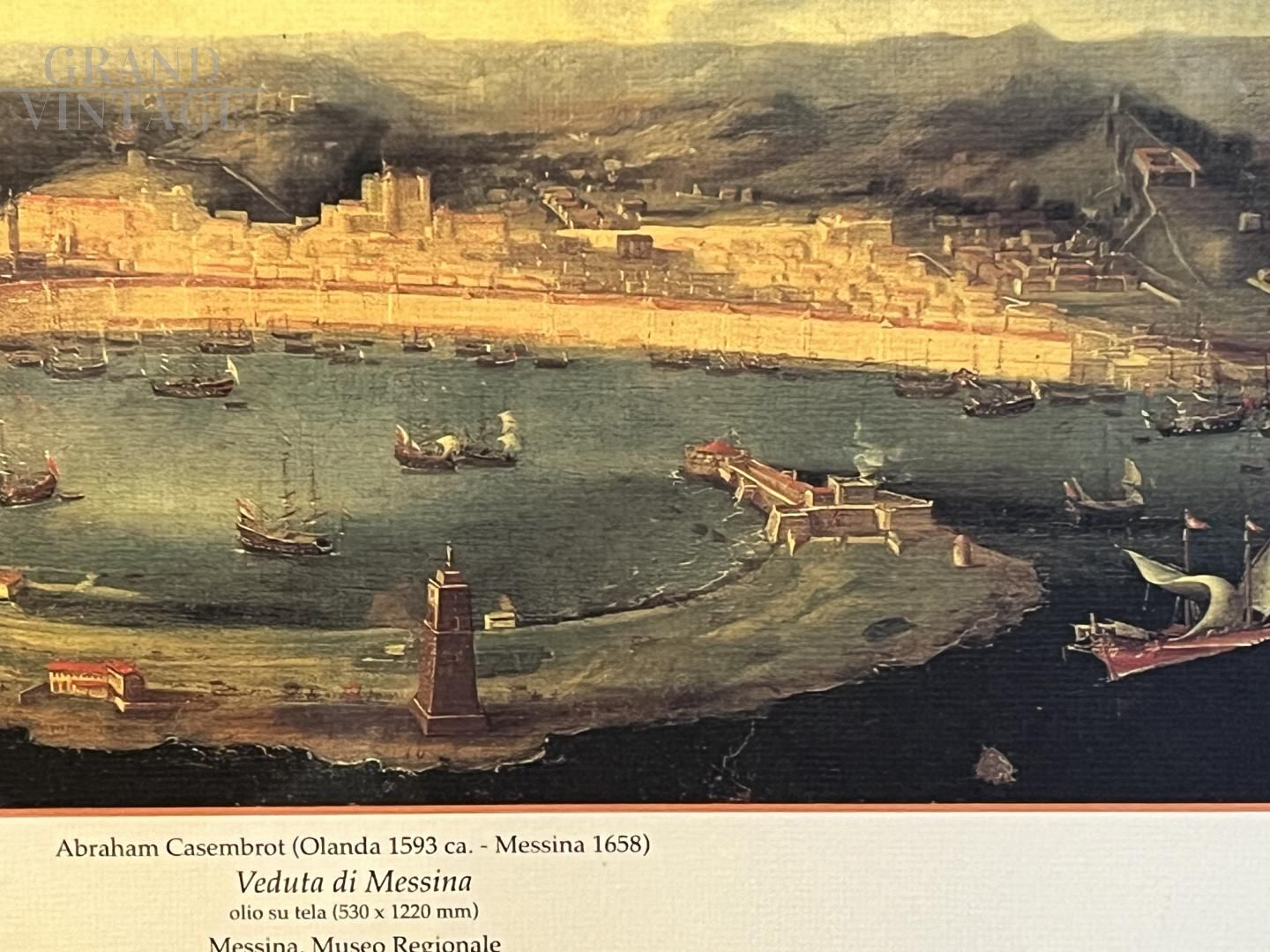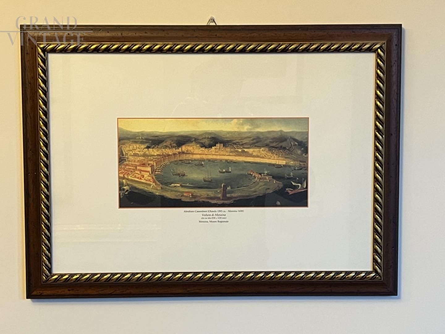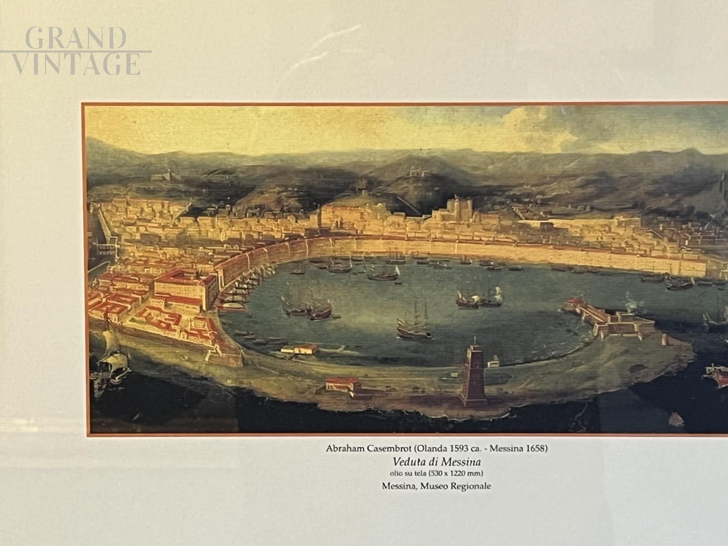 Stampa a colori raffigurante la pesca del pesce spada nello stretto di Messina secondo un dipinto realizzato nel XVII secolo dal pittore olandese Abraham Casembrot ed oggi conservato al Museo Nazionale della Certosa di San Martino di Napoli. La stampa è incorniciata e in ottime condizioni.