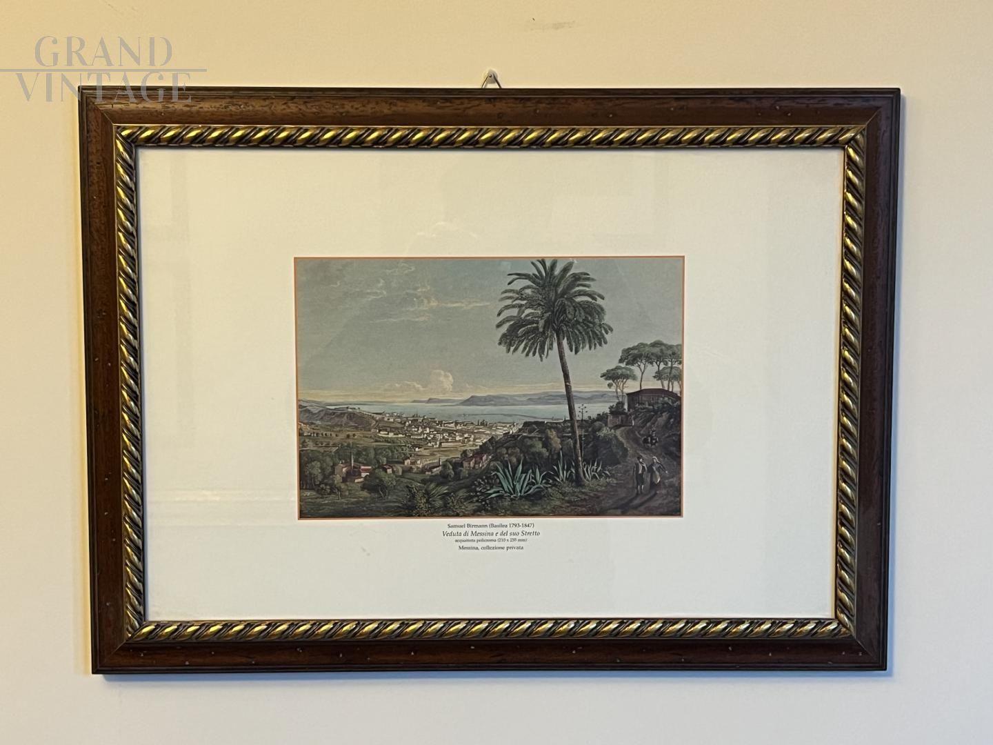 Stampa a colori raffigurante una veduta ottocentesca di Messina e del suo stretto secondo un dipinto dell'artista svizzero Samuel Birmann. La stampa è incorniciata e in ottime condizioni.