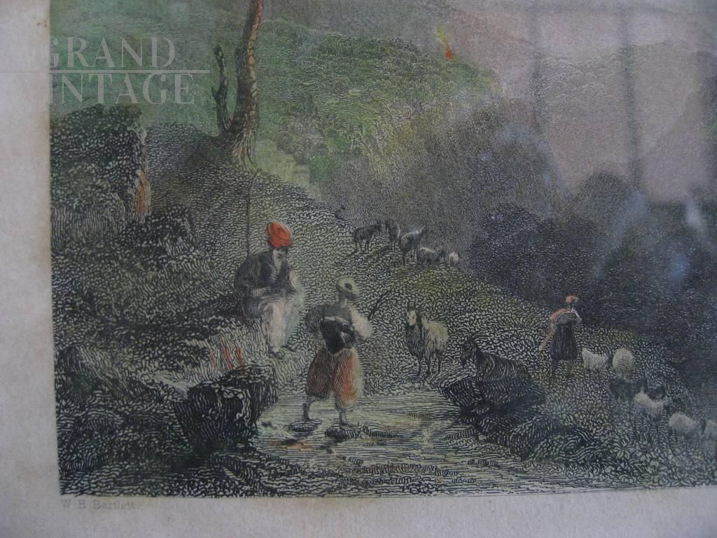 Antica stampa colorata entro cornice con vetro, dal titolo Village of Eden - Village d’Eden et Tombeau du Consul Fisher. Son. & cp. London & Paris 1842.