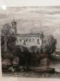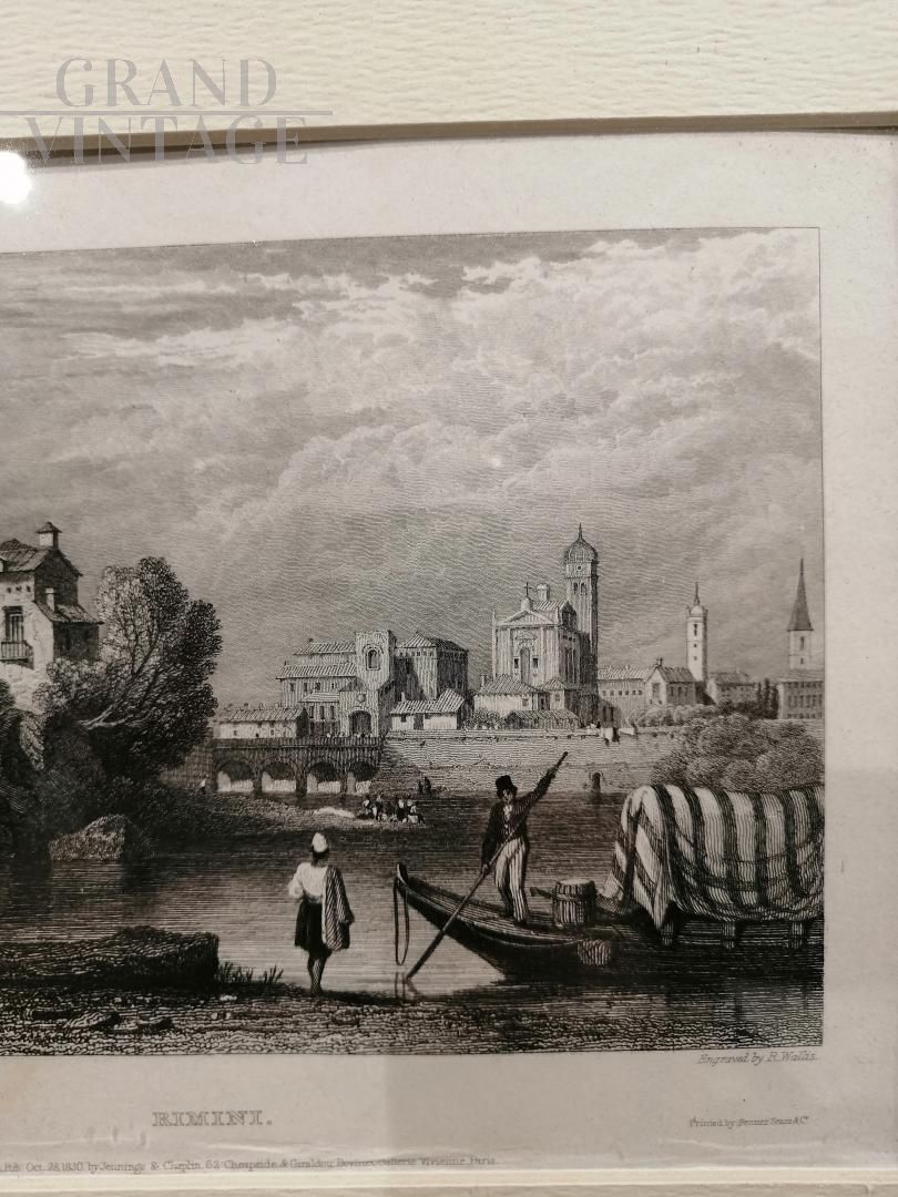 Stampa inglese di Rimini con ponte di Tiberio e chiesa di San Giuliano sullo sfondo - 1800.