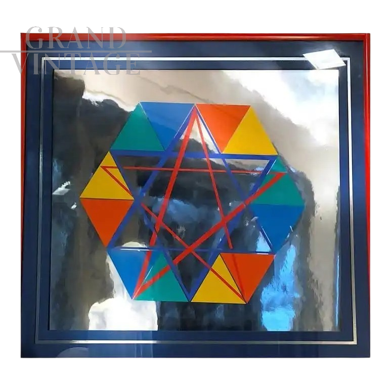 Serigrafia di Yaacov Agam su superficie a specchio raffigurante la Stella di David - Illusionismo astratto in diversi colori: blu, rosso, giallo e verde. L'opera è firmata, numerata 223 / 250 e datata 1979, ed è completa di cornice. Yaacov Agam nacque nel 1928 a Rishon le-Zion, in Israele, e si trasferì a Parigi nel 1951, dove studiò nello studio di Jean Dewasne. Lì incontrò grandi pittori contemporanei, tra cui Marc Chagall, Fernand Léger e Auguste Herbin, che ebbero una notevole influenza sulle sue magnifiche opere d'arte.