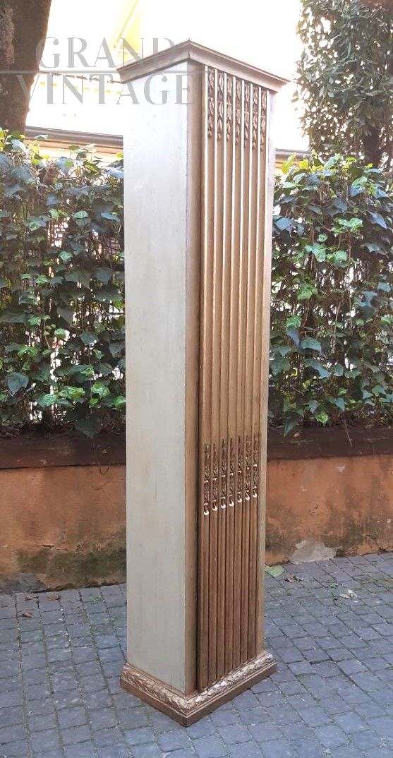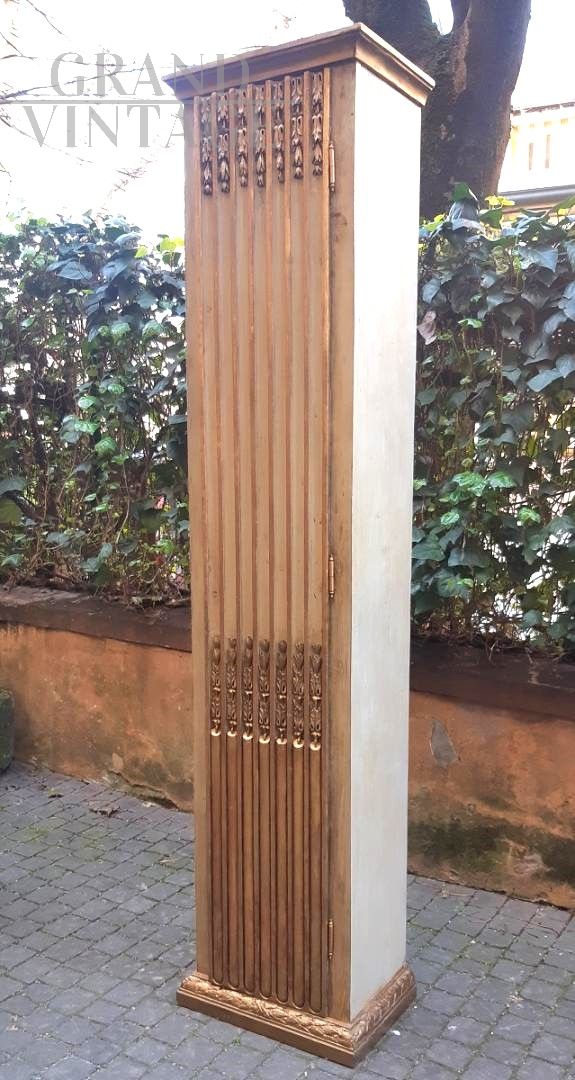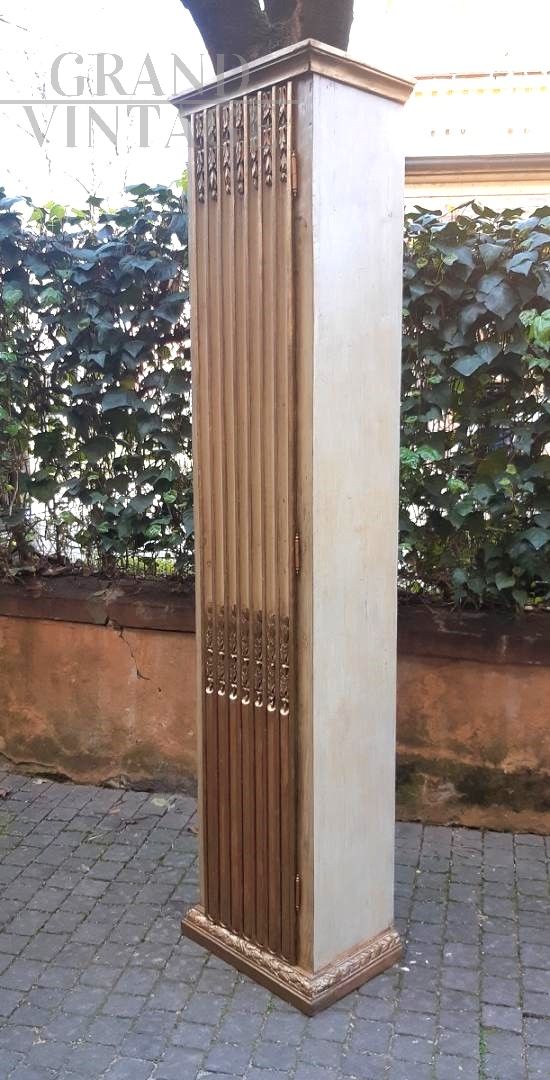 Armadietto, piccola credenza o stipetto antico a colonna o a pilastro alto e stretto in legno dorato e laccato, mobile veneziano del '700, elegante ed inconsueto con frontale a colonna scanalato con canne d'organo ed inserti finemente intagliati. Il basamento presenta un capitello a corona d'alloro, un insieme curioso e di assoluta qualità.