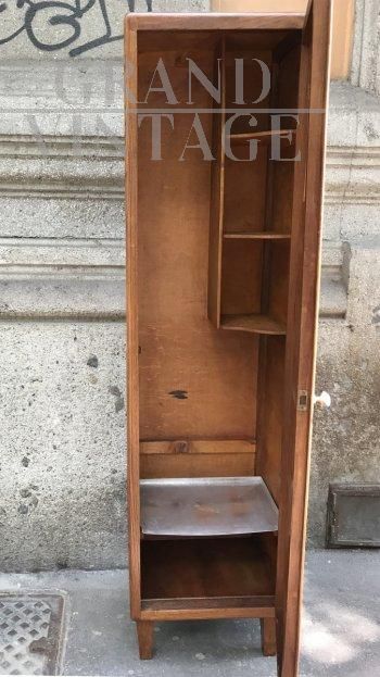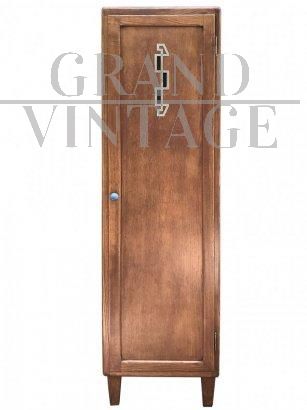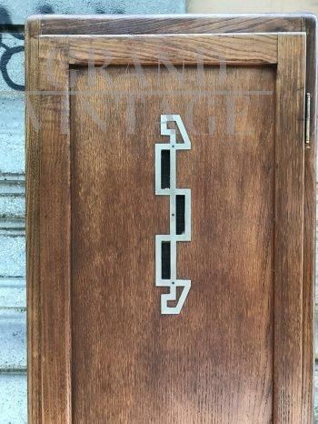 Stipetto o armadietto vintage di epoca art déco in legno di rovere ad un’anta con decorazione in ottone, completo di mensole interne.