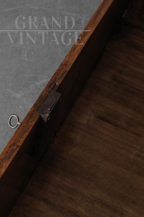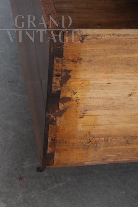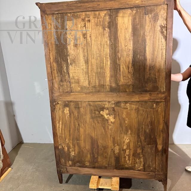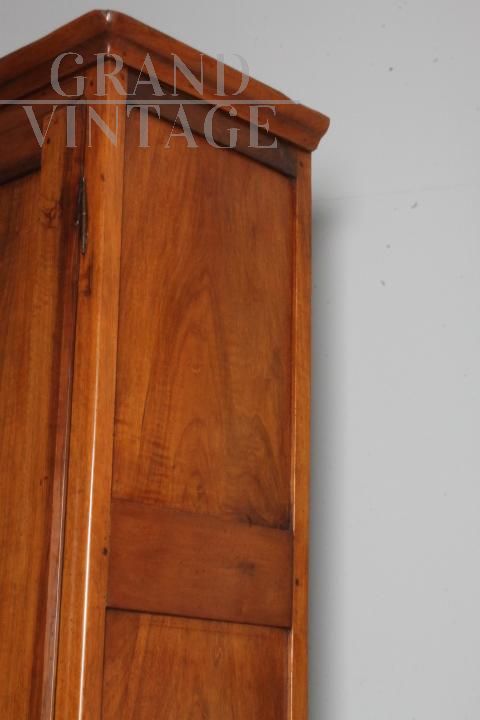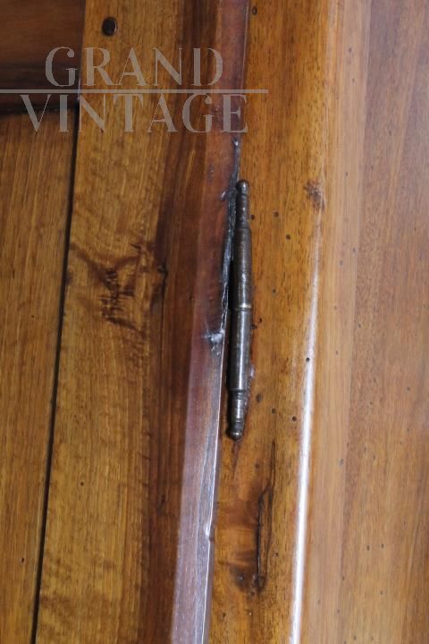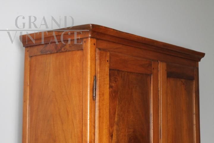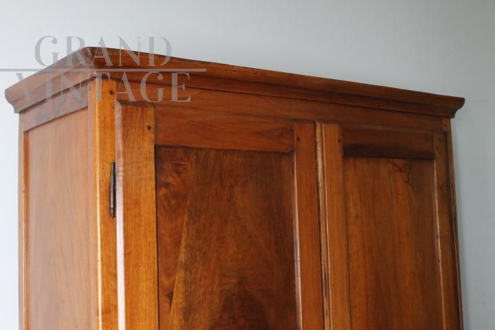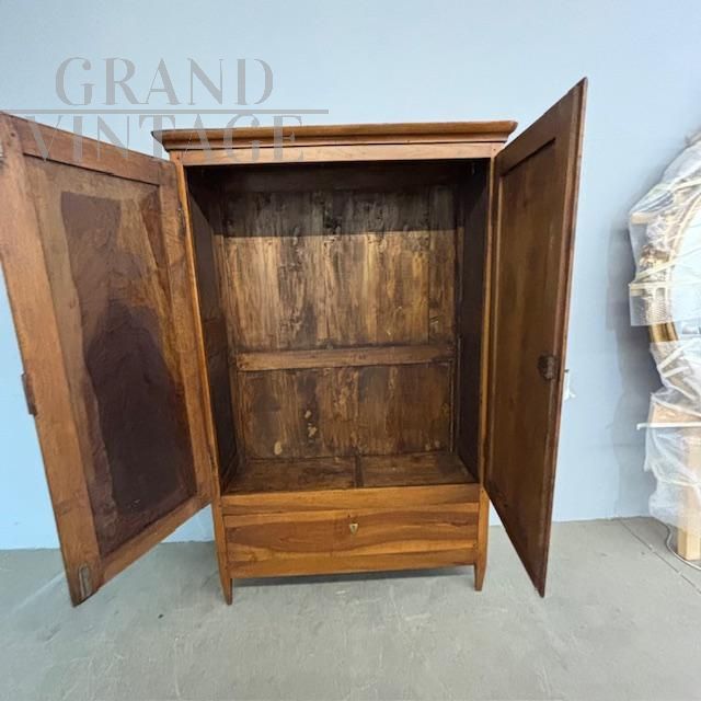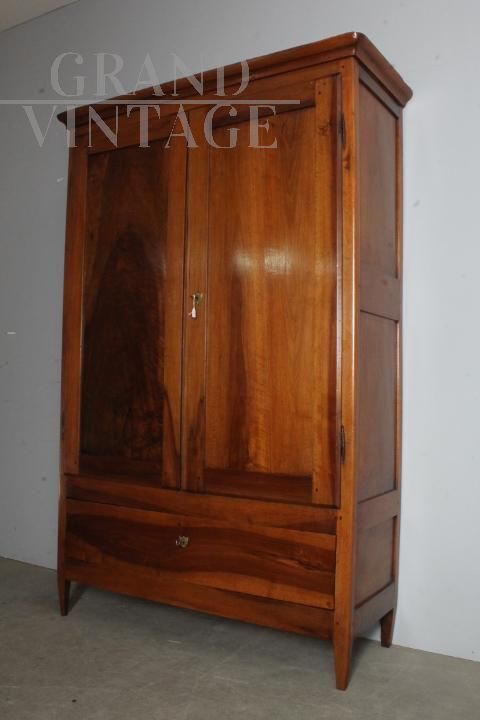 Stipo armadio antico in noce della fine del XVIII secolo, di linea semplice e pulita, con due ante con asta per appendere abiti e cassetto inferiore. Corpo unico non smontabile, gambe tronco piramidali con cornice sopra stondata. Misure interessanti! Il mobile è restaurato e pronto da inserire in ambiente.