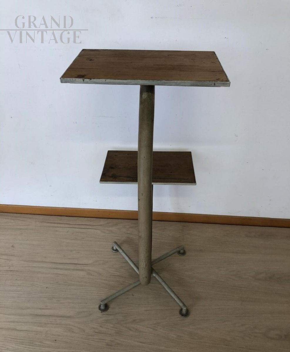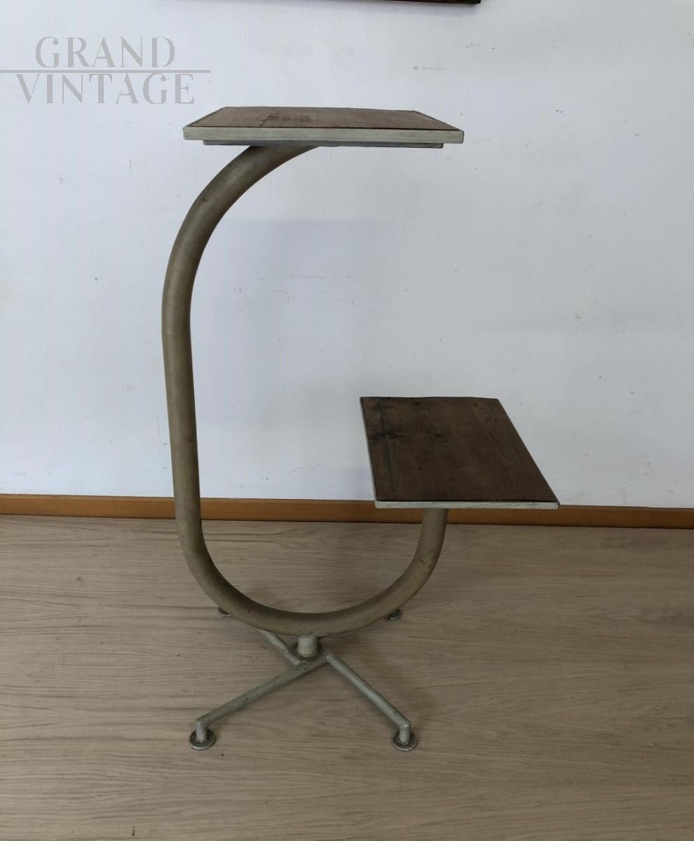 Struttura piedistallo vintage stile industriale in ferro con due ripiani in legno, utilizzabile anche come tavolino, porta tv o porta piante, anni '50.