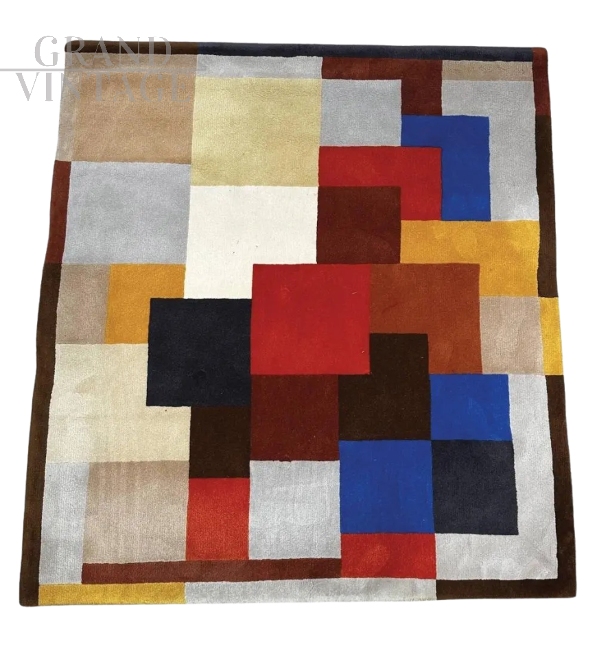 Magnifico tappeto Labyrinthe di Sonia Delaunay per edizioni Arcturial, realizzato nel 1929, 100% lana annodata a mano con blocchi di colore con astrazioni simmetriche nei toni del rosso, blu, nero, giallo, beige e bianco, numerato 58 / 150, misura 220 x 245 cm. In condizioni eccellenti, senza difetti visibili.
