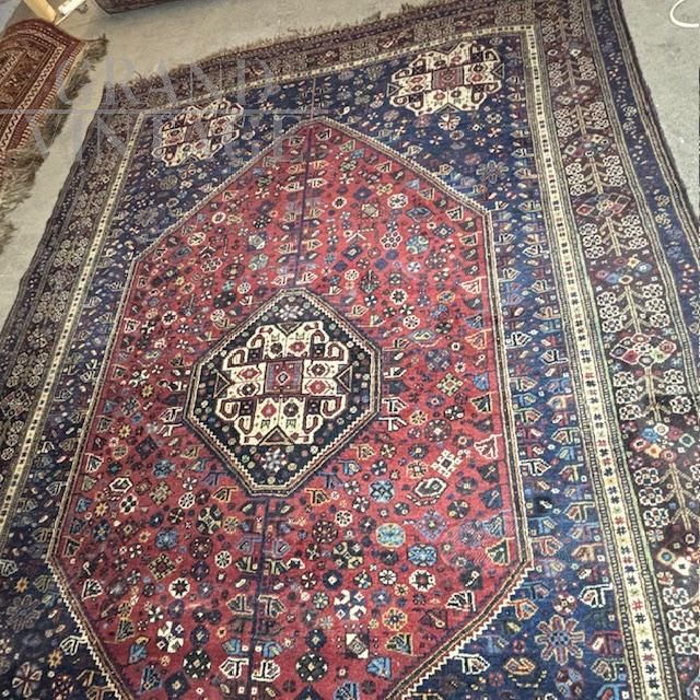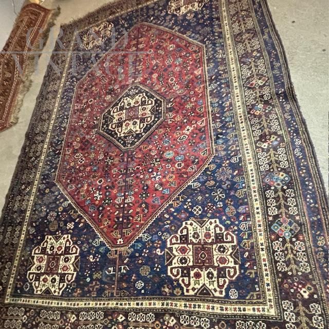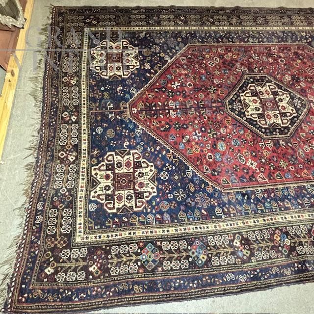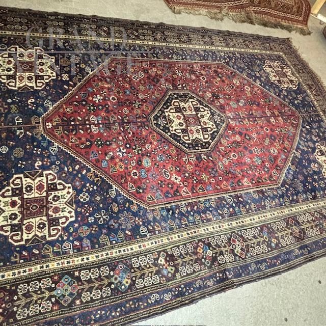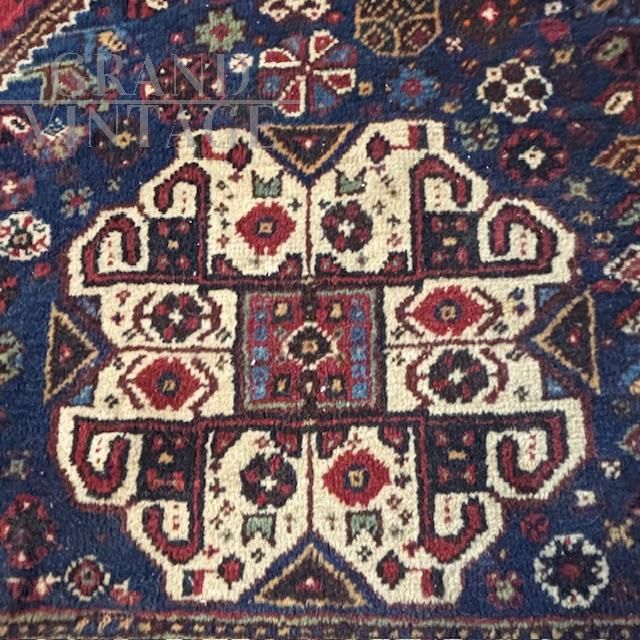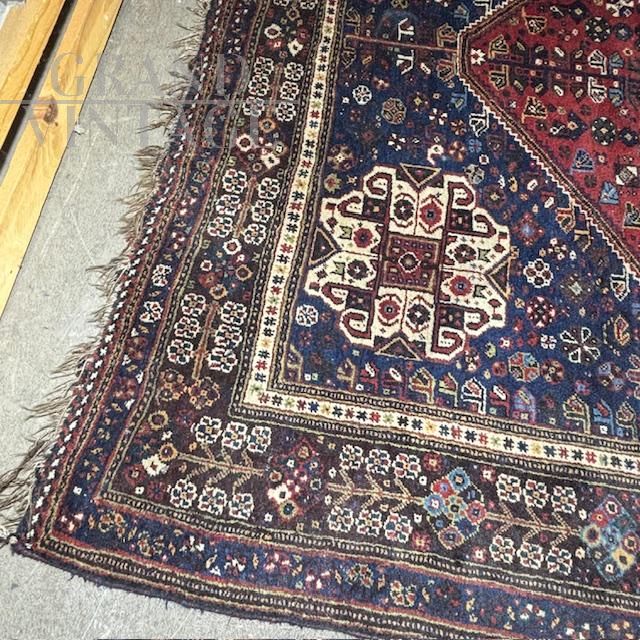 Tappeto Persiano Ashfar degli anni '30 intrecciato a mano con motivi floreali e geometrici nei colori prevalenti del rosso e del blu, di grandissima qualità e ottimamente preservato, proviene da un'importante eredità.