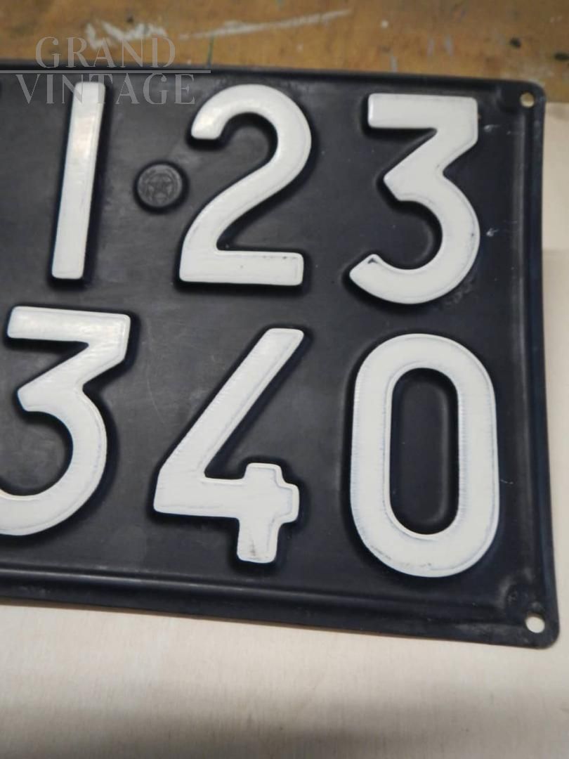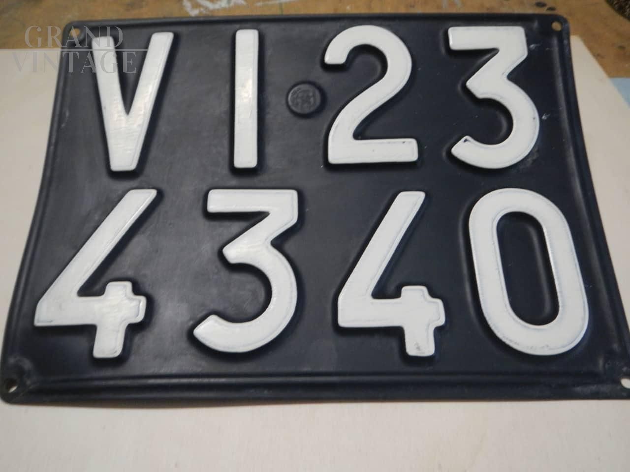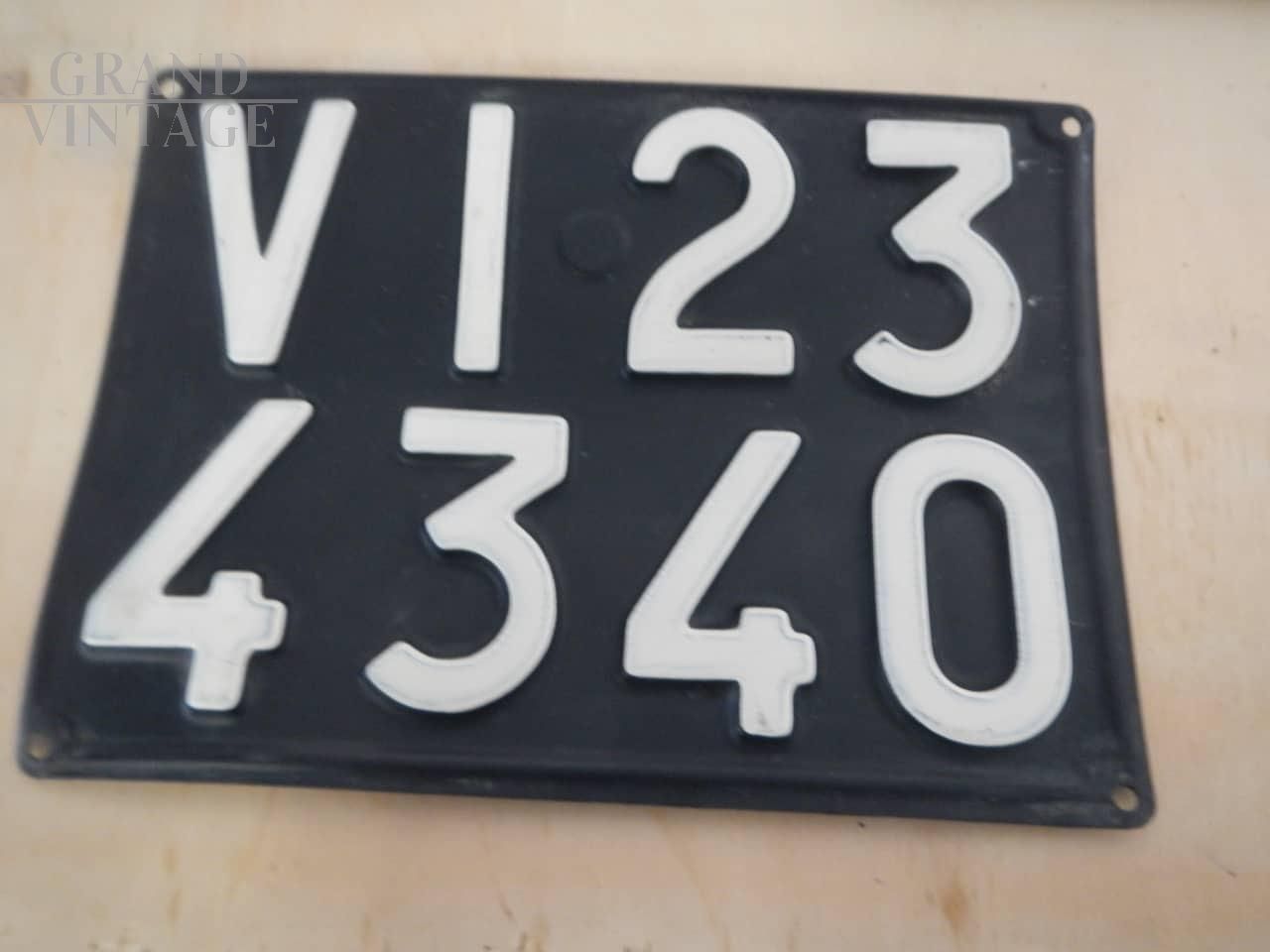 Targa anteriore di automobile vintage anni '60 in plastica Vicenza VI15. Compare il simbolo della Repubblica Italiana, e cioè una stella a 5 punte all’interno di una ghirlanda e con al centro le lettere RI.
