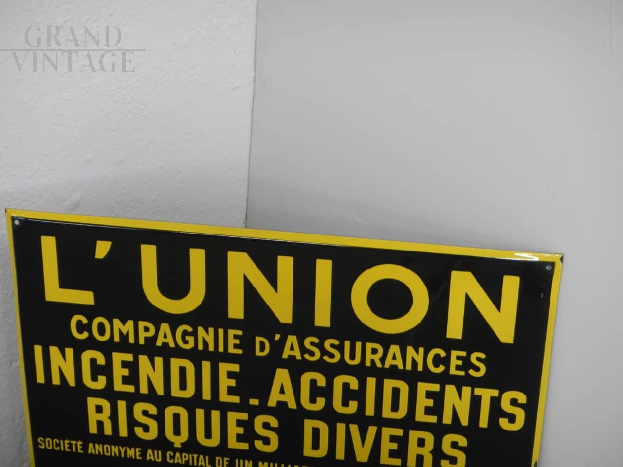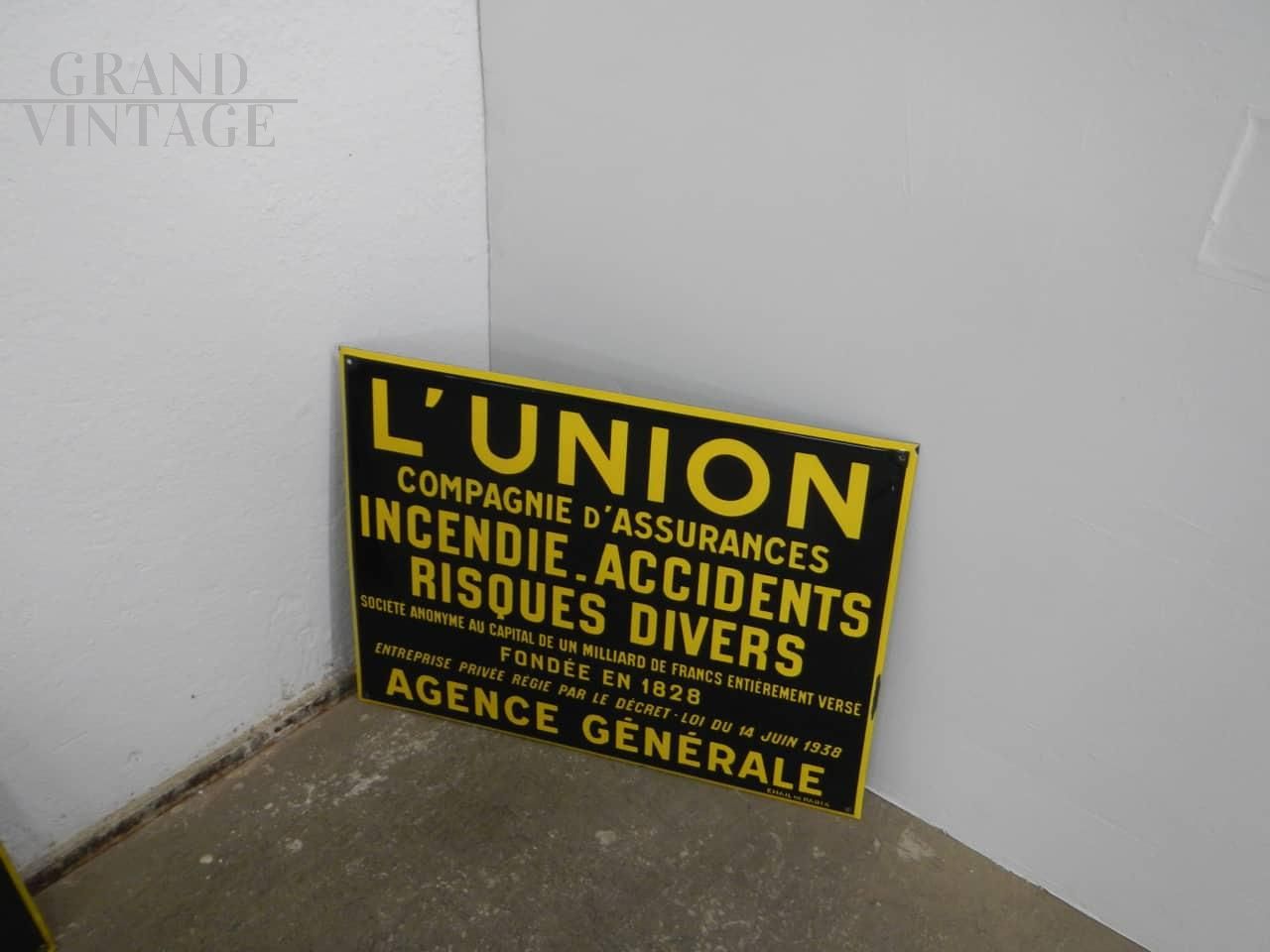 Targa pubblicitaria vintage di agenzia assicurativa francese in metallo curvato smaltato nero con scritta gialla L'Union Compagnie d'Assurances, prodotta negli anni '30 / '40. Non c’è alcun marchio dello smaltatore. La targa è completa di fori per appenderla. Disponibili 2 pezzi, il prezzo di riferisce al singolo pezzo. Una delle due targhe presenta i segni del tempo più dell'altra.