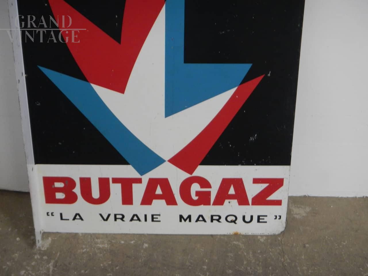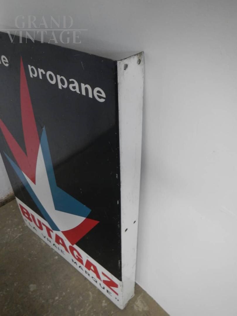 Insegna targa pubblicitaria francese bifacciale in metallo dell'azienda Butagaz, con sostegno laterale per appenderla, completamente originale.
