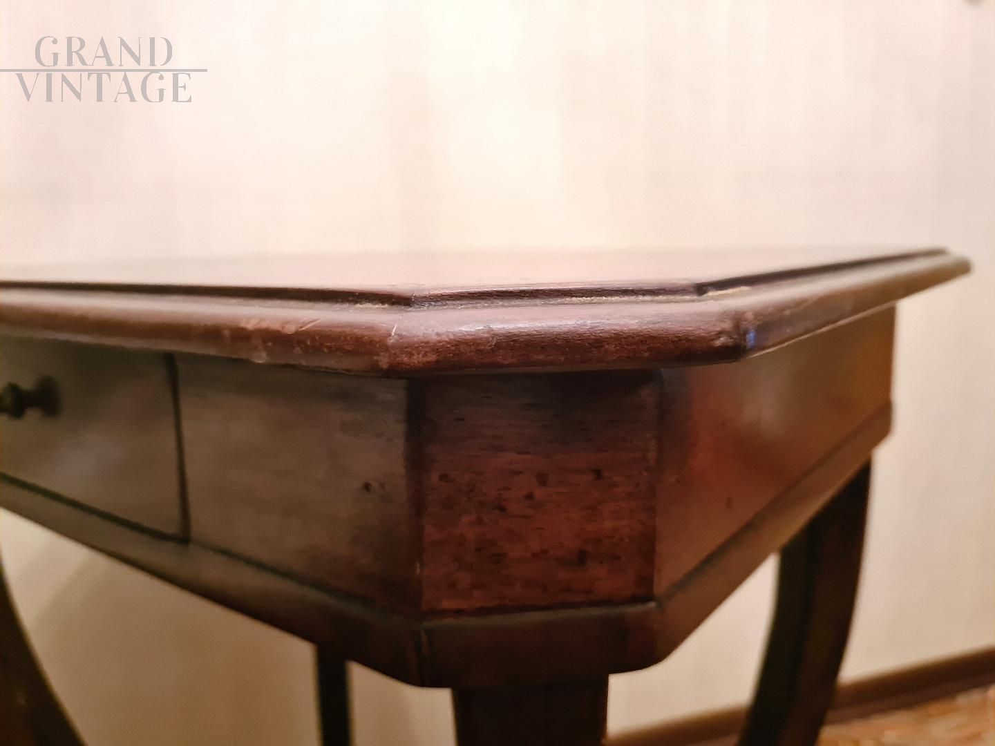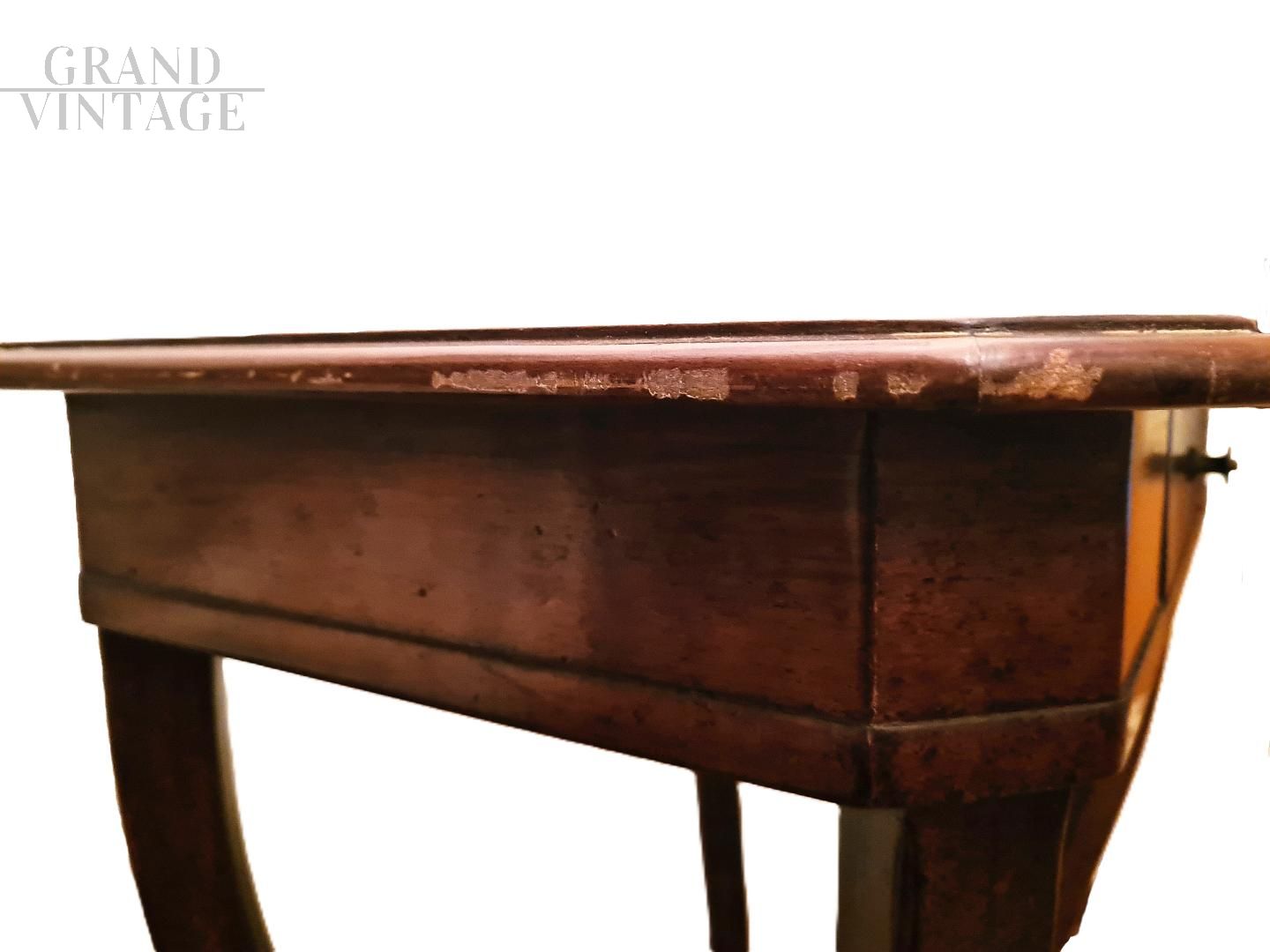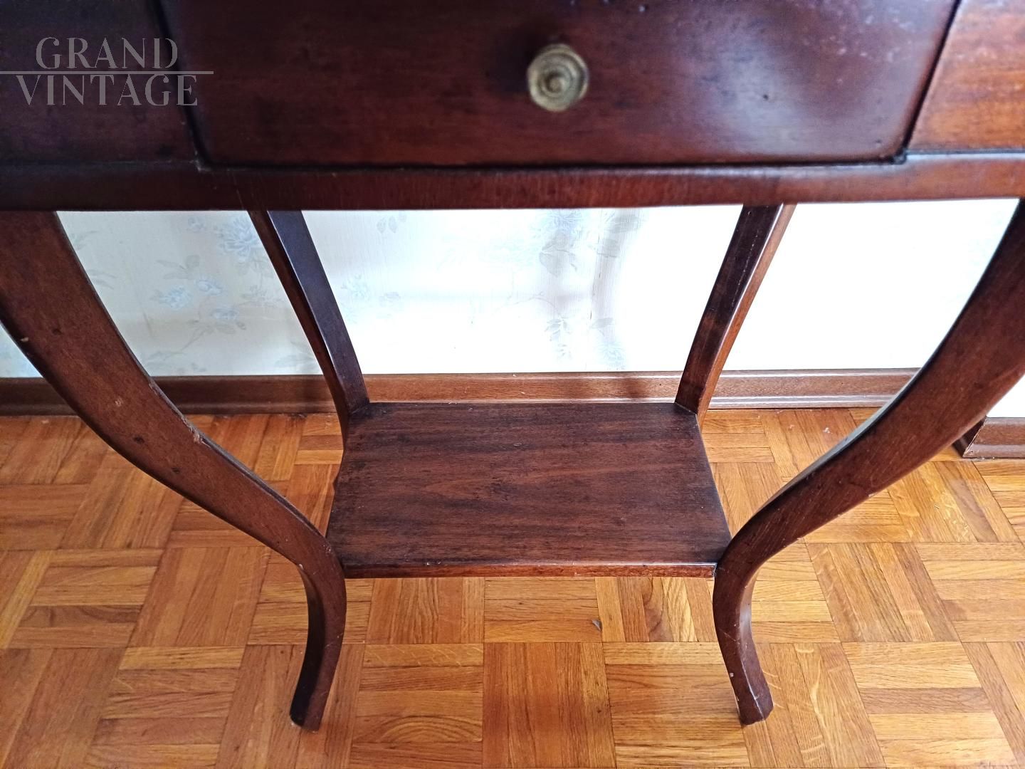 Tavolino da appoggio console antico in stile Biedermeier risalente alla metà dell’Ottocento: Finitura in mogano, piano con sottili intarsi lineari, cassetto frontale con pomello in ottone, gambe curve a lira finemente sagomate raccordate armoniosamente su un piano di appoggio inferiore. In buone condizioni originali, presenta naturali segni del tempo.