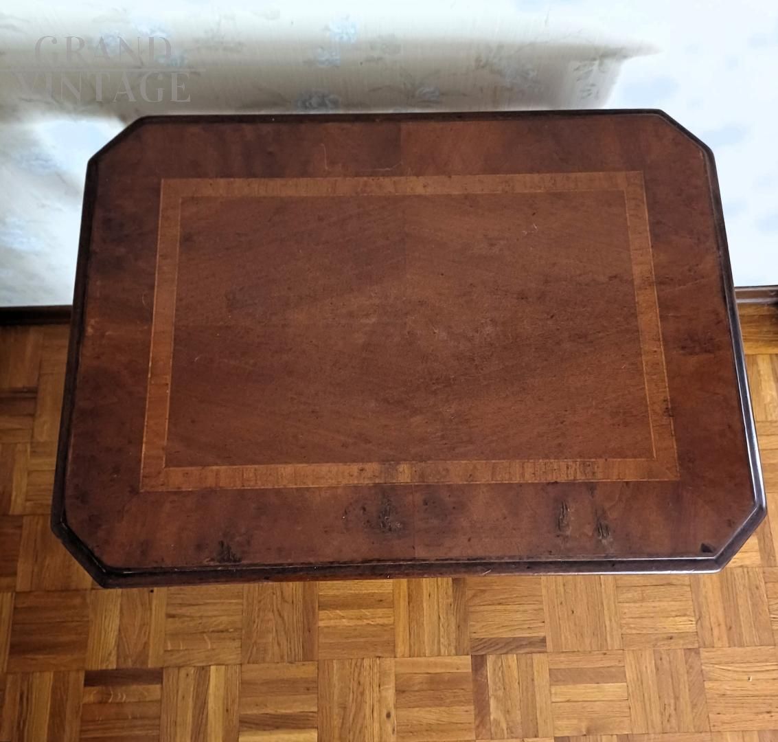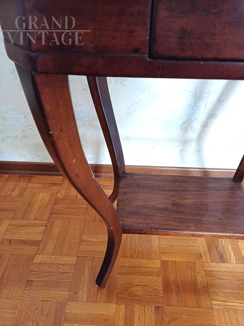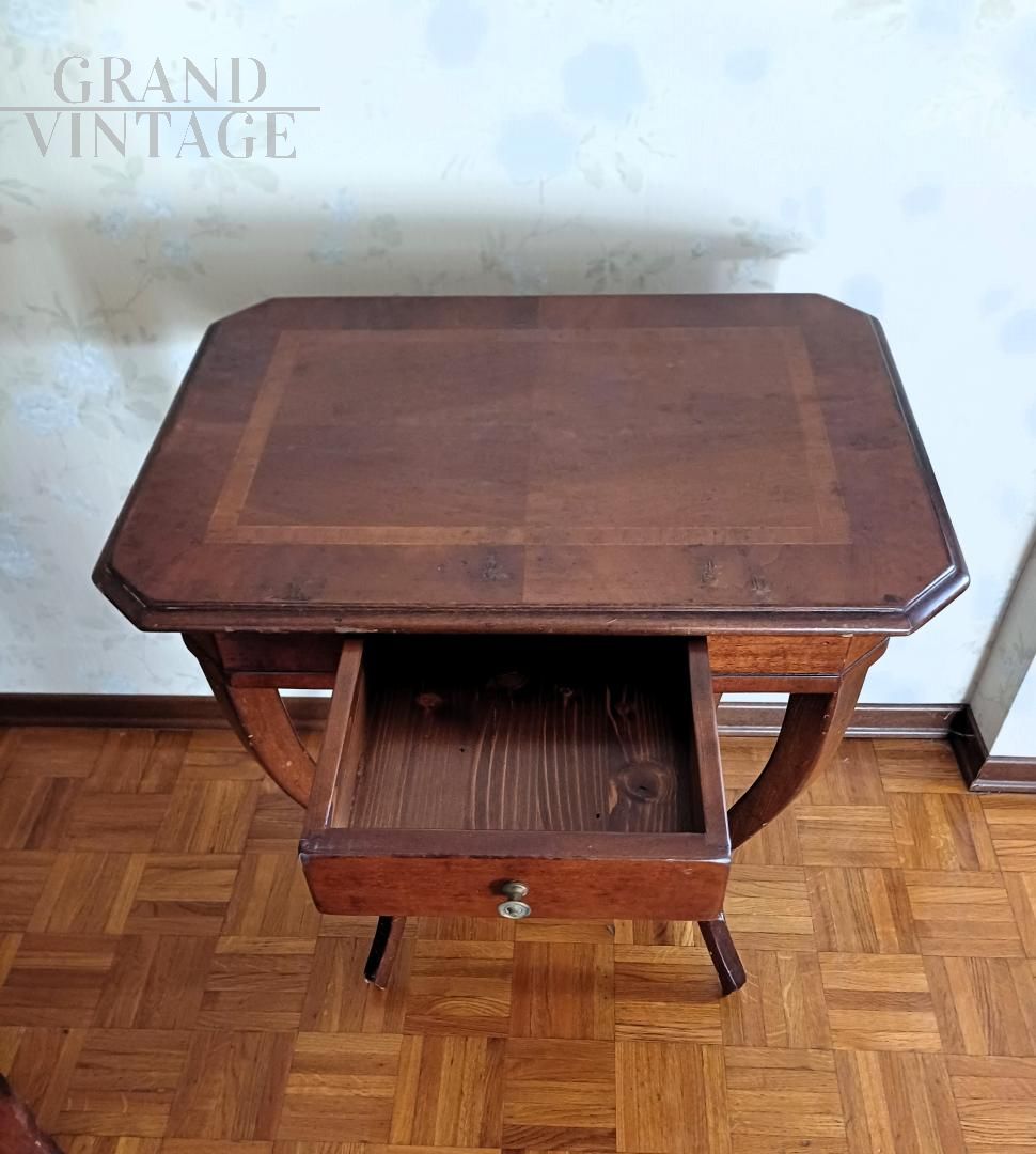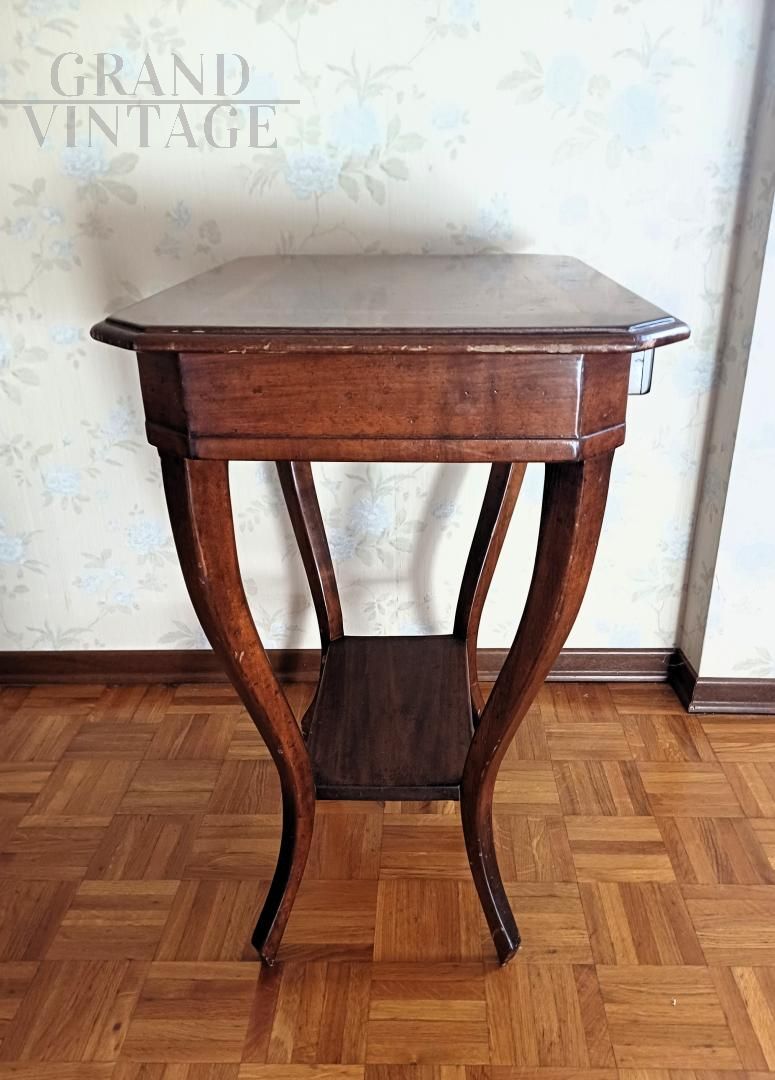 Tavolino da appoggio console antico in stile Biedermeier risalente alla metà dell’Ottocento: Finitura in mogano, piano con sottili intarsi lineari, cassetto frontale con pomello in ottone, gambe curve a lira finemente sagomate raccordate armoniosamente su un piano di appoggio inferiore. In buone condizioni originali, presenta naturali segni del tempo.